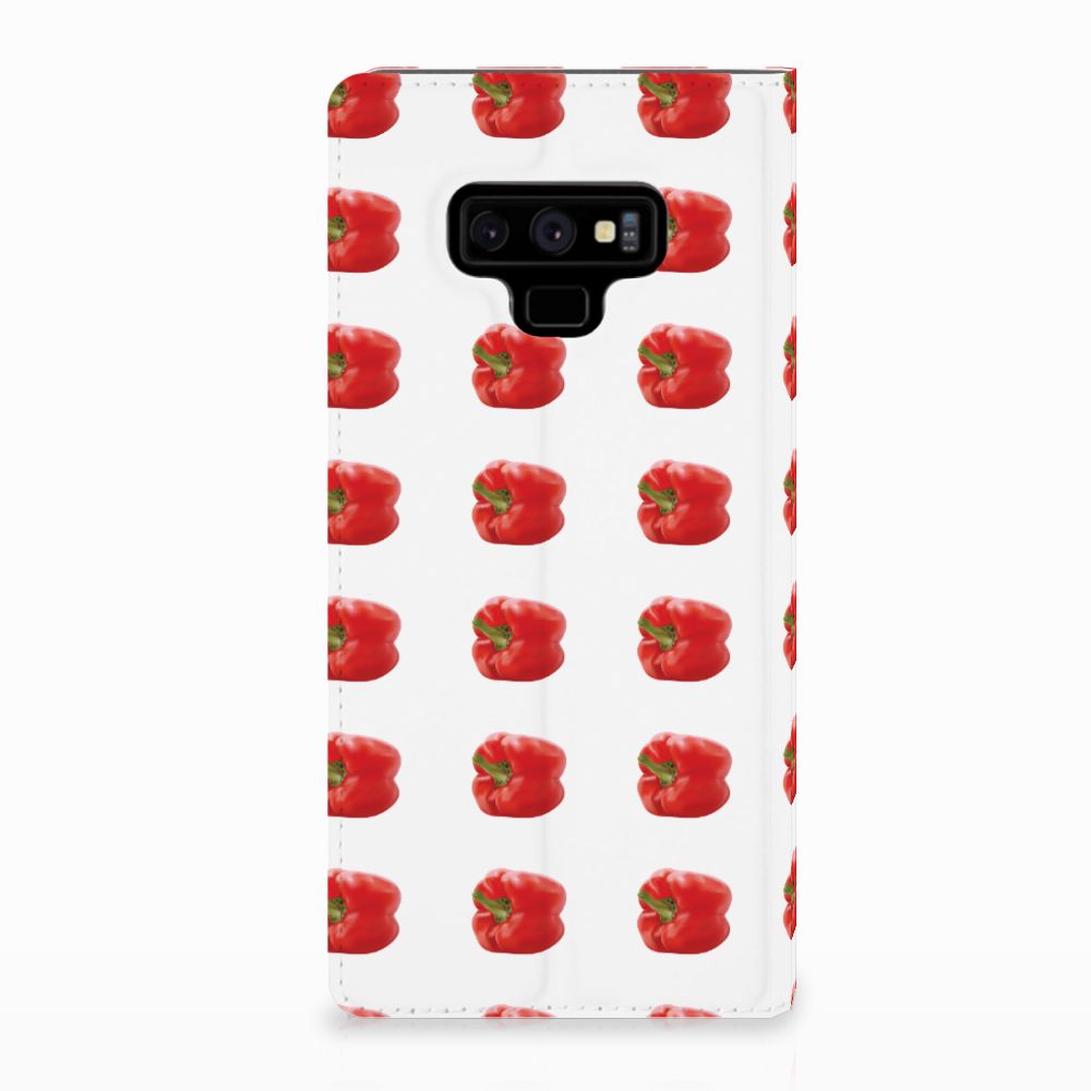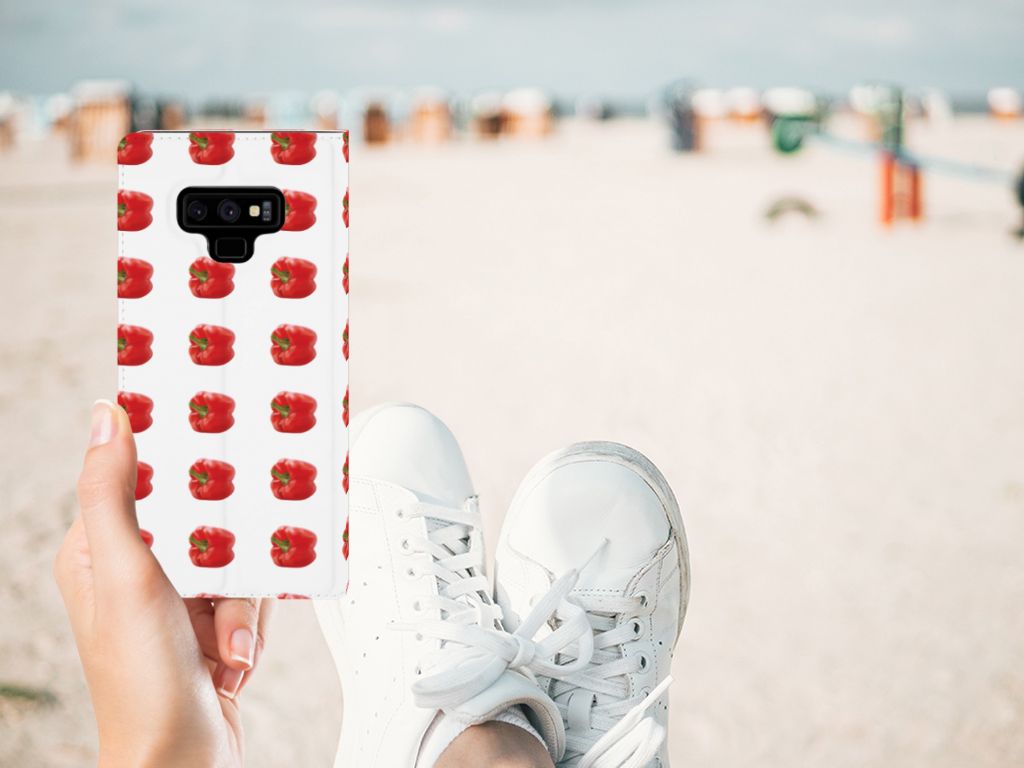 Er zit pit in jouw Samsung Galaxy Note 9 Flip Style Cover dankzij dit design met rode paprika’s. Paprika’s zijn er in allerlei kleuren en vormen en ze hebben gemeen dat ze heel erg gezond zijn. De rode paprika’s op deze case staan op een grijs met witte geblokte achtergrond en vormen een opvallende verschijning. Heb jij ooit iemand in je nabije omgeving rond zien lopen met een design hoesje met rode paprika’s? Waarschijnlijk niet. Dit stand hoesje met rode paprika’s beschermt jouw telefoon aan alle zijden en beschikt over een opbergvakje voor een pasje of briefgeld. De case sluit perfect af met de magneet aan de binnenzijde. Zeker weten dat je met dit hoesje met rode paprika’s een smartphone accessoire te pakken hebt waarmee je jezelf in de schijnwerpers zet. De houder aan de binnenzijde van de stand case met rode paprika’s is van TPU. Als je andere kleuren paprika’s op je hoesje wilt, raden we je aan ons assortiment design hoesjes te bekijken of zelf een hoesje te ontwerpen.