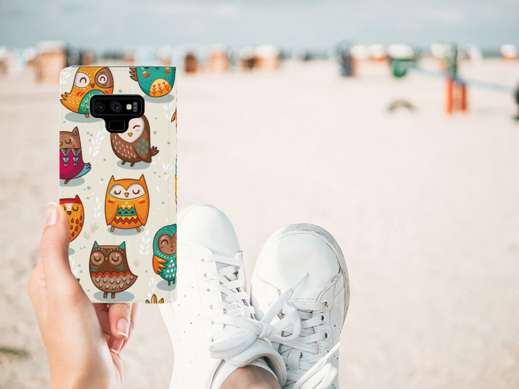 Deze Samsung Galaxy Note 9 Hoesje maken met Vrolijke Uilen is echt iets voor de nachtbrakers onder ons. De uil is zoals je weet bij uitstek een vogel die in de nachtelijke uren actief is. Ben jij ook iemand die s ’nachts tot leven komt, dan is deze stand case met uilen in felle kleuren echt iets voor jou. Als je tot in de late uurtjes op stap bent, komt het goed uit dat jouw smartphone aan alle kanten goed is beschermd met deze stand case met uilen. De case met uilen heeft een magnetische sluiting aan de binnenkant, waardoor de hoes niet openklapt als die uit je handen valt. Jouw creditcard of pinpas heb je als het goed is veilig opgeborgen in het vakje aan de binnenzijde. De houder aan de binnenzijde van de case met print van uilen is van het flexibele TPU. De wat ruigere types hebben veel baat bij deze stand case met uilen in felle kleuren.