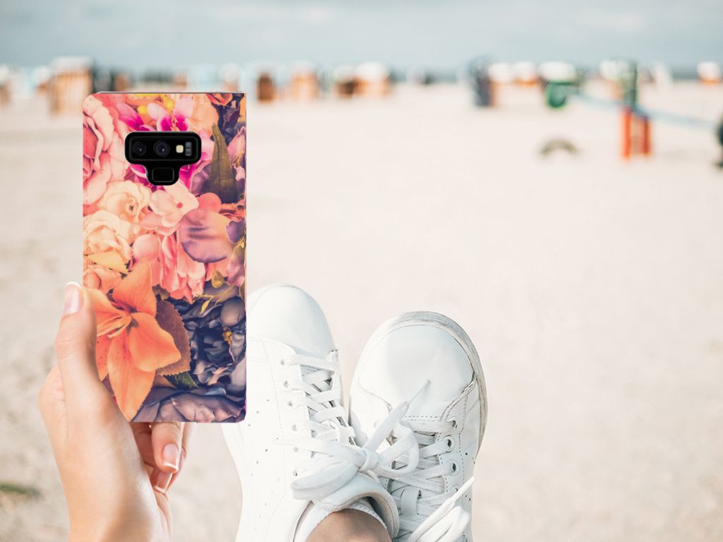 Dit Bosje Bloemen doet een mens en zijn smartphone goed. De oranje, paarse en roze bloemen op deze Samsung Galaxy Note 9 Smart Cover geven jouw smartphone een zeer sierlijke uitstraling. Je wordt er ook meteen vrolijker van als je aan het appen, mailen of aan het bellen bent. Valt dan je telefoon op de grond, dan zal er dankzij de stand case met oranje, paarse en roze bloemen geen schade ontstaan. Onze stand cases met oranje, paarse en roze bloemen bieden de allerbeste bescherming en zijn heel praktisch, wat blijkt uit onder meer het vakje aan de binnenkant en de handige standaard waarmee je de smartphone rechtop op tafel neer kunt zetten. De oranje, paarse en roze bloemen passen goed op alle zijden van de case. Op deze stand case van leer en TPU (houder aan de binnenkant) is het ook mogelijk je eigen ontwerp te zetten. In no time maak je zelf een stand case met daarop foto’s van jouw favoriete bloemen.