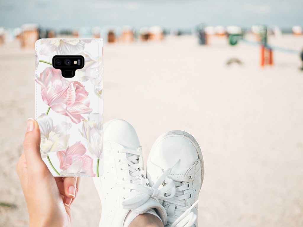 Een bosje bloemen doet een mens (en zijn smartphone) goed. De witte en roze bloemen op dit Samsung Galaxy Note 9 Smart Cover geven jouw smartphone een zeer mooie uitstraling. Je wordt er ook meteen een stuk rustiger van als je aan het appen of aan het bellen bent. Valt dan je telefoon op de grond, dan zal er dankzij de stand case met het design Lovely Flowers ontstaan. Onze stand cases met roze en witte bloemen zien er zeer prettig uit en zijn heel praktisch, wat blijkt uit onder meer het vakje aan de binnenkant en de handige standaard waarmee je de smartphone rechtop op tafel neer kunt zetten. De roze en witte bloemen passen goed op alle zijden van de case. Op deze stand case van leer en TPU (houder aan de binnenkant) kun je trouwens ook je eigen bloemige ontwerp zetten. In een paar simpele stappen maak je zelf een stand hoesje met daarop jouw mooiste bloemen.