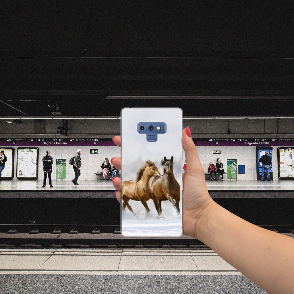 Voor de paardenliefhebbers onder ons hebben we onze collectie uitgebreid met dit design hoesje met print van paarden. Vroeger hield de mens vooral werkpaarden, inmiddels hebben we vriendschap gesloten met het paard. Vandaar dat het ook een favoriet dier is op onze smartphonehoesjes, zoals deze tpu case. Een TPU Hoesje voor de Samsung Galaxy Note 9 met Paarden is niet alleen super mooi en chique, maar ook nog eens zeer flexibel. Verder is de case schokabsorberend en heeft het opstaande randen. Zie je liever je eigen paard terug op een hoesje. Dat kan! Door zelf een uniek hoesje te ontwerpen, met eigen foto’s en teksten. De TPU case wordt aan de bovenzijde bedrukt, de zijkanten blijven transparant.
