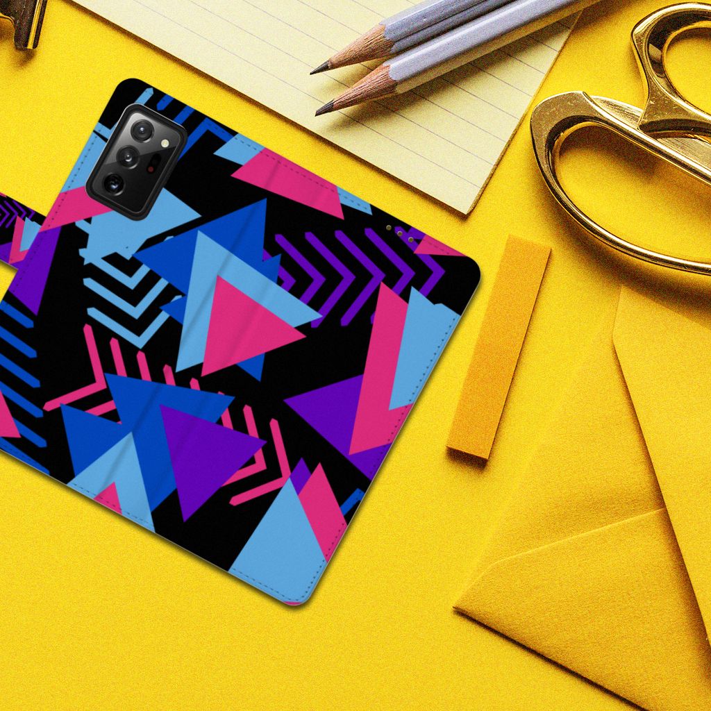 Dit fraaie hoesje met het design Funky Triangle is alles behalve eenvoudig en sober. Dat komt goed uit, want je hebt natuurlijk ook geen doorsnee telefoon gekocht. Mocht je dat wel hebben gedaan, dan wordt hij meteen speciaal als je een Samsung Galaxy Note20 Ultra Book Case koopt voor een spotprijsje. Een ding is zeker: opvallen ga je beslist met dit hoesje met paarse, roze en blauwe driehoeken. Jij zult in je element zijn met dit design hoesje met paarse, roze en blauwe driehoeken, omdat het er schitterend uitziet en jouw telefoon perfect beschermt. Het smartphonehoesje beschermt jouw telefoon aan alle zijden en beschikt over verschillende houders voor pasjes en briefgeld. De case sluit perfect af met een lipje aan de buitenkant. De houder aan de binnenzijde is van TPU. Alle zijden van het hoesje worden bedrukt, inclusief het lipje. De paarse, roze en blauwe driehoeken maken de case helemaal af.