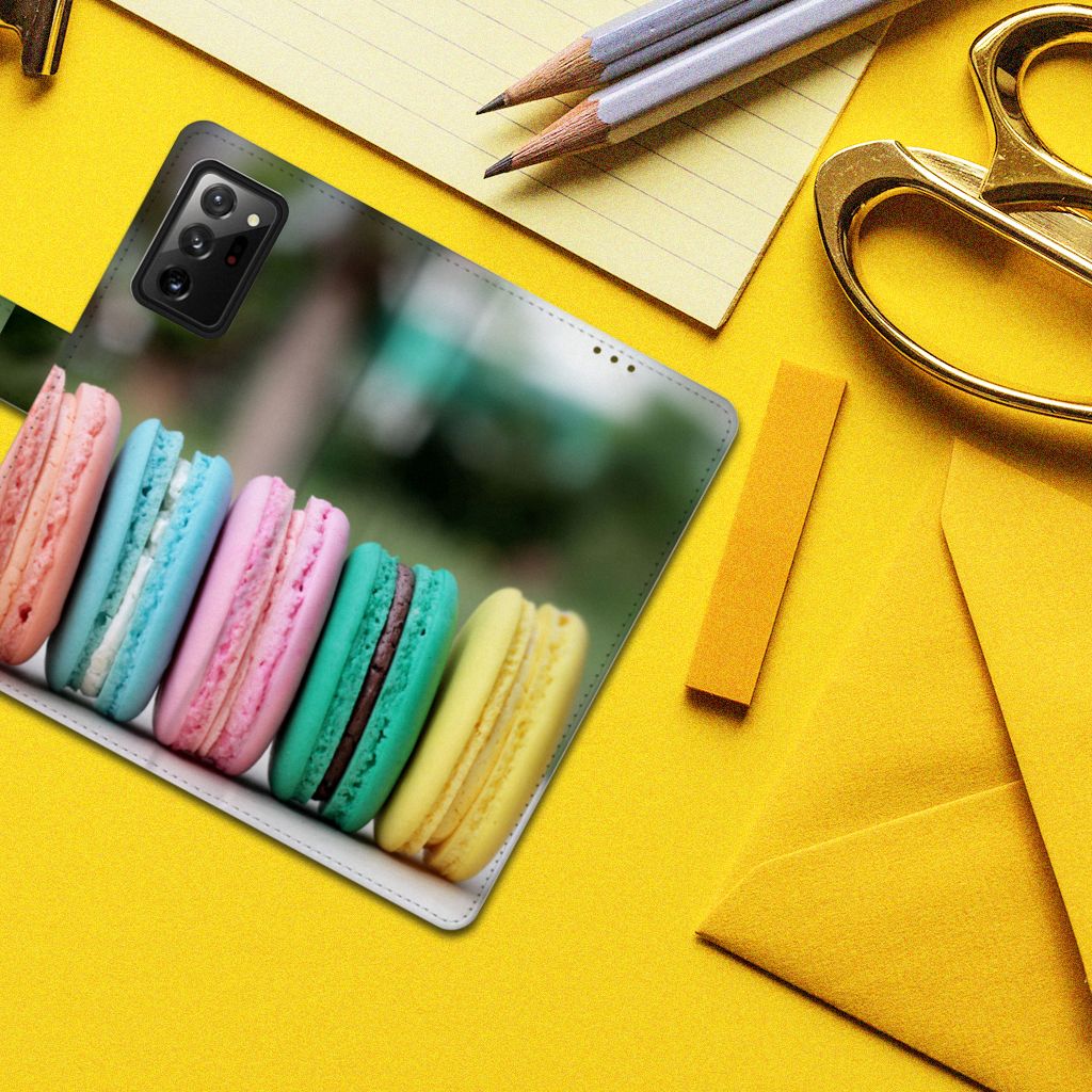 Dit hoesje met macarons is een zeer opvallende bescherming voor jouw smartphone. Macarons zijn Franse koekjes: kleine, rond en luchtig. Ze zijn aan elkaar geplakt met een zachte vulling. Ze worden in veel verschillende smaken gemaakt, herkenbaar aan de verschillende kleuren zoals chocolade (donkerbruin), mokka (middenbruin), kersen (rood), pistache (groen), aardbei (roze), framboos (karmijn), citroen (geel) en kokos (roomwit). Deze kleuren kun je natuurlijk ook zien op dit fraaie design hoesje met macarons. Heb je altijd al een Samsung Galaxy Note20 Ultra Book Cover willen hebben met macarons? Grijp dan nu je kans. Een boekhoesje heeft zeer veel goede eigenschappen, zoals opbergvakjes aan de binnenkant en een magnetische sluiting in de vorm van een lipje aan de buitenzijde. Dit design hoesje met macarons wordt aan alle zijden bedrukt, zelfs het lipje krijgt een afbeelding van een macaron. De houder aan de binnenkant van het hoesje is van TPU.