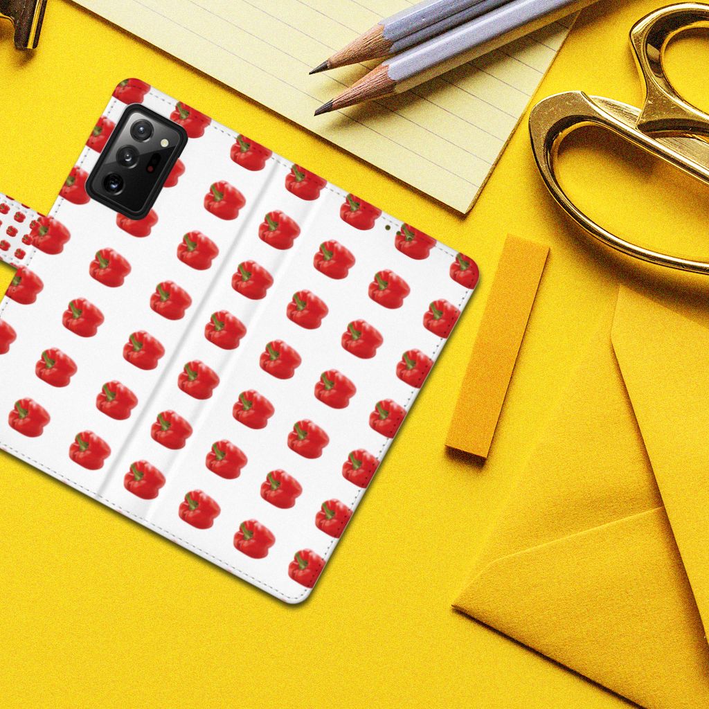 Er zit pit in jouw Samsung Galaxy Note20 Ultra Book Cover dankzij dit design met rode paprika’s. Paprika’s zijn er in allerlei kleuren en vormen en ze hebben gemeen dat ze heel erg gezond zijn. De rode paprika’s op deze case staan op een grijs met witte geblokte achtergrond en vormen een opvallende verschijning. Heb jij ooit iemand in je nabije omgeving rond zien lopen met een design hoesje met rode paprika’s? Waarschijnlijk niet. Dit boekhoesje met rode paprika’s beschermt jouw telefoon aan alle zijden en beschikt over verschillende opbergvakjes voor pasjes en briefgeld. De case sluit perfect af met het magnetische lipje aan de buitenkant. Zeker weten dat je met dit hoesje met rode paprika’s een smartphone accessoire te pakken hebt waarmee je jezelf in de schijnwerpers zet. De houder aan de binnenzijde van het boekhoesje met rode paprika’s is van TPU. Als je andere kleuren paprika’s op je hoesje wilt, raden we je aan ons assortiment design hoesjes te bekijken of zelf een hoesje te ontwerpen.