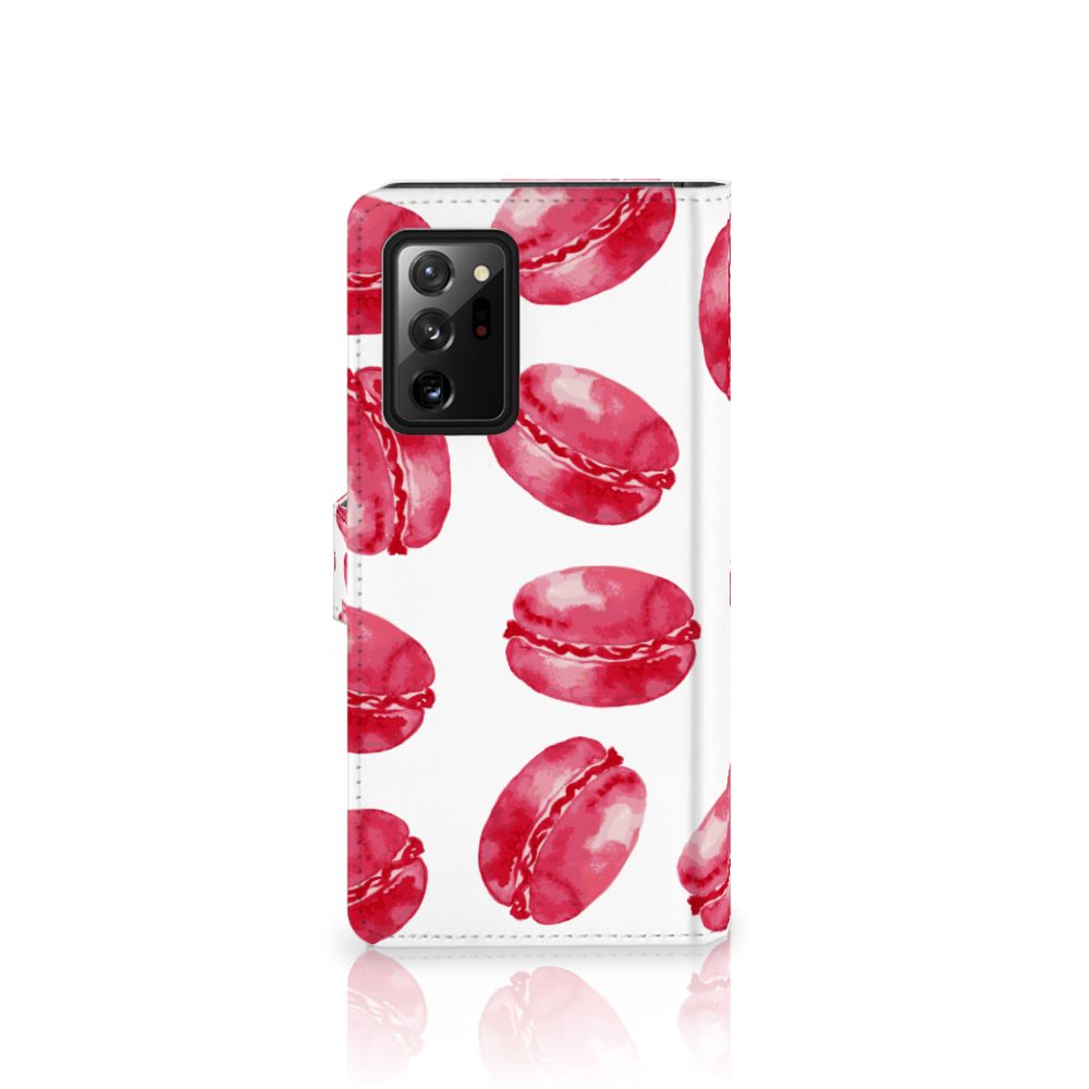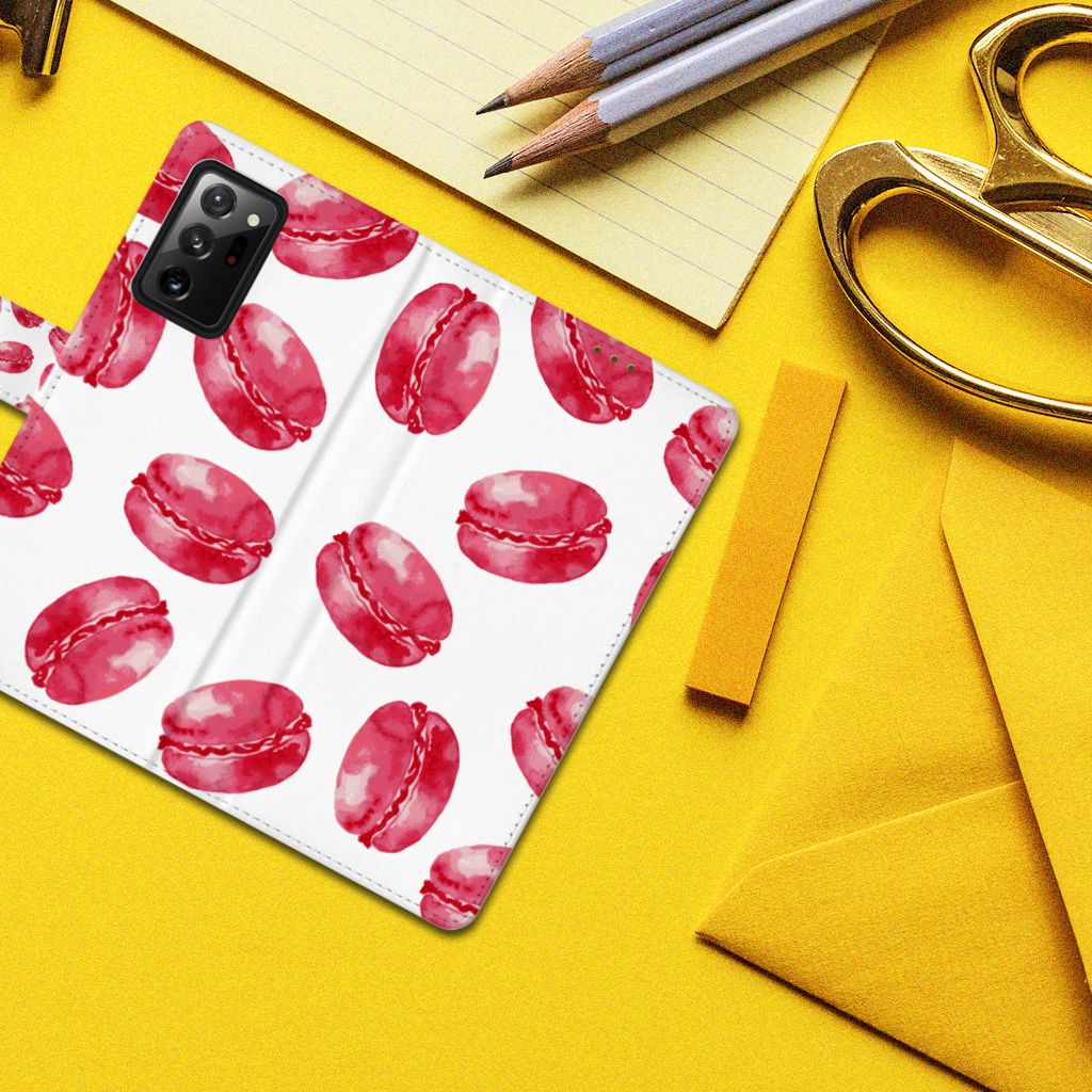 Dit hoesje met Pink Macarons is een zeer opvallende bescherming voor jouw smartphone. Macarons zijn Franse koekjes: kleine, rond en luchtig. Ze worden in veel verschillende smaken gemaakt, herkenbaar aan de verschillende kleuren zoals chocolade (donkerbruin), mokka (middenbruin), kersen (rood), pistache (groen), aardbei (roze), framboos (karmijn). Deze kleuren kun je niet allemaal zien op dit fraaie design hoesje met roze macarons. Heb je altijd al een Samsung Galaxy Note20 Ultra Book Cover willen hebben met roze macarons? Grijp dan nu je kans. Een boekhoesje heeft zeer veel goede eigenschappen, zoals opbergvakjes aan de binnenkant en een magnetische sluiting in de vorm van een lipje aan de buitenzijde. Dit design hoesje met roze macarons wordt aan alle zijden bedrukt, zelfs het lipje krijgt een afbeelding van een roze macaron. De houder aan de binnenkant van het hoesje is van TPU.