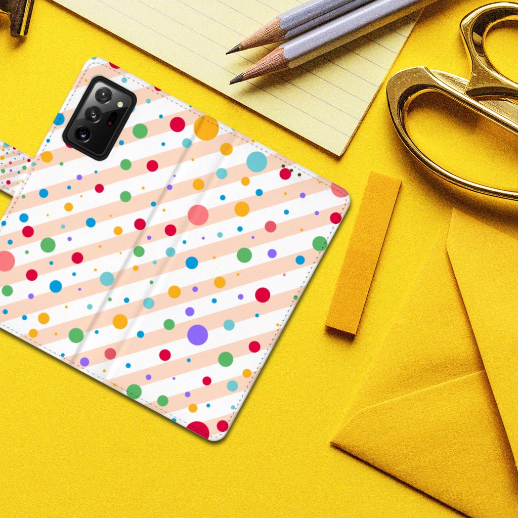 Een Samsung Galaxy Note20 Ultra Telefoon Hoesje met verschillende kleuren stippen is een schitterende bescherming van jouw smartphone. Het boekhoesje met het design Dots in alle kleuren van de regenboog komt voor jou als geroepen. Maak je geen gebruik van dit zeer mooie hoesje, dan kan het met jouw smartphone een beetje beroerd aflopen. Dit mooie boekhoesje met verschillende kleuren stippen zorgt voor een volledige bescherming van je smartphone en wordt aan alle zijden bedrukt. Sommige stippen staan ook op het magnetische lipje aan de buitenzijde. Verder is de houder aan de binnenzijde van TPU. Jouw telefoon is dus zeer goed opgeborgen en kan geen kant op. Met een hoesje met stippen in verschillende kleuren op alle zijden blijft jouw telefoon volledig in tact. Heb je liever een boekhoesje met stippen in andere opvallende kleuren? Ontwerp dan zelf case met je eigen foto’s en teksten!