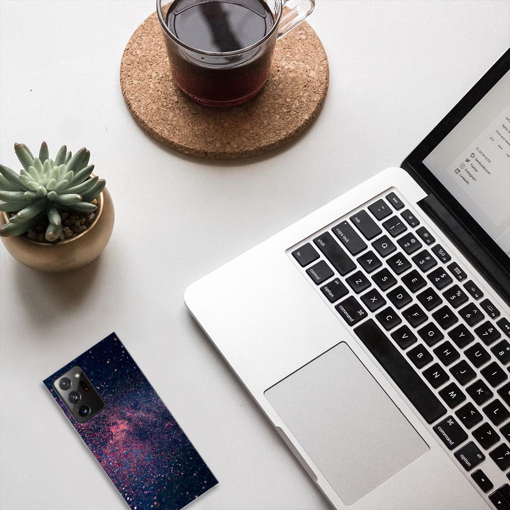 Je waant je in de zevende hemel met dit kunstzinnige, glitterachtige design hoesje met paarse en blauwe kleuren tegen een inktzwarte achtergrond. Het smartphone hoesje heeft ook een wat science fiction achtige allure. Met deze design Stars case zul je zeker opvallen. Als dit je bedoeling is, bestel dat snel dit waanzinnig mooie product voor je Samsung Galaxy Note20 Ultra. Het telefoonhoesje is van alle gemakken voorzien en combineert een hele fraaie uitstraling met maximaal comfort. Bovendien is het gemaakt van zeer stevig en flexibel materiaal. Het unieke design, door B2C Telecom ontworpen, staat op een TPU Hoesje. Dit hoesje wordt alleen aan de bovenkant bedrukt en is zeer flexibel. De randen van het hoesje blijven transparant en worden niet bedrukt. Met dit hoesje past jouw telefoon altijd in je broekzak.