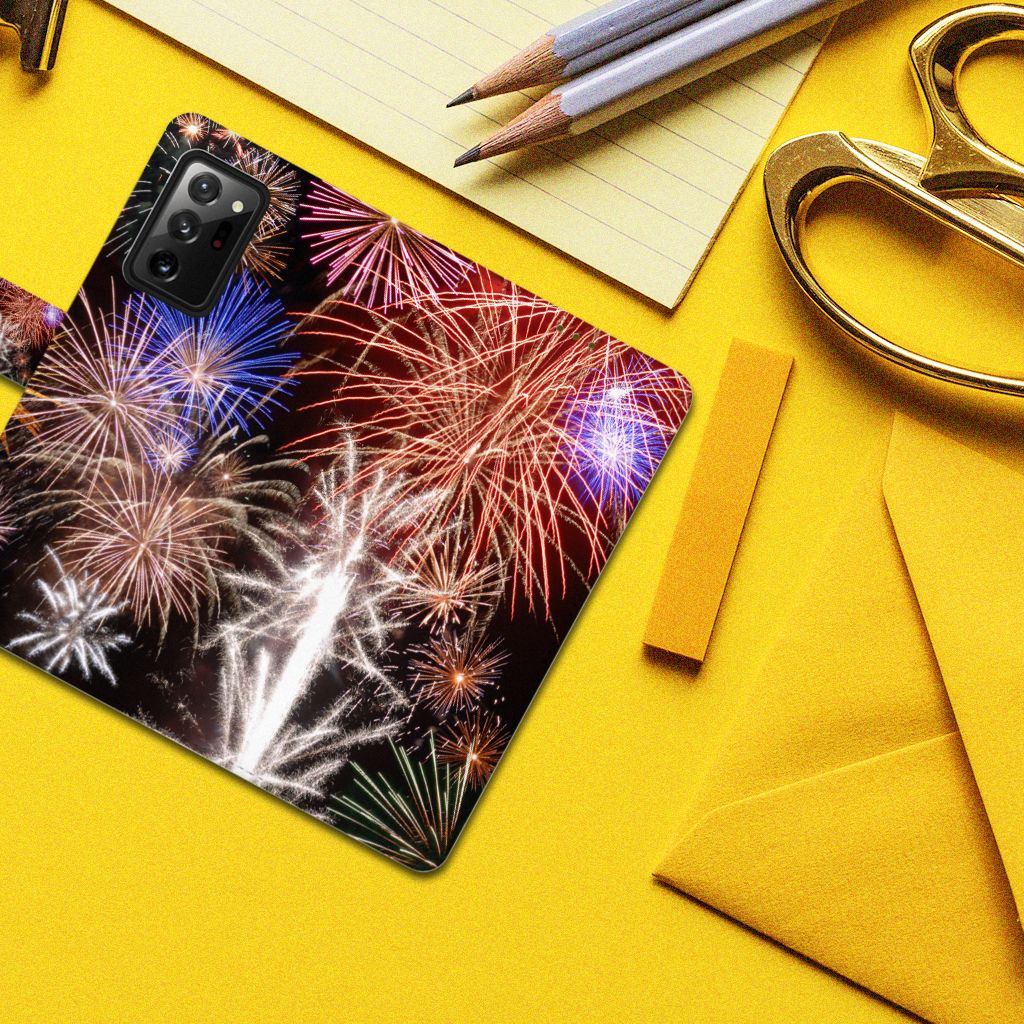 Dit Samsung Galaxy Note20 Ultra Wallet Case met Pasjes levert gegarandeerd Vuurwerk op. Kijk alleen al eens naar de print van siervuurwerk, in zeer veel verschillende kleuren. Als je dit hoesje ziet kun je bijna niet geloven dat sommige gemeenten in Nederland overwegen om vuurwerk te verbieden. Er gebeuren weliswaar ongelukken mee, maar zoiets schitterends als op dit boekhoesje met vuurwerk wil je toch gewoon niet missen. Bovendien beschermt dit hoesje jouw smartphone ook nog eens aan alle kanten. Alle zijden van dit hoesje worden bedrukt. De case heeft een lipje aan de buitenzijde voor het afsluiten van de telefoon en de houder aan de binnenzijde is van TPU. Onder alle omstandigheden zal deze case met verschillende opbergvakjes perfect functioneren, ook als je met nieuwjaar vuurwerk aan het afsteken bent. Zorg dan overigens wel dat je zelf ook voldoende afgeschermd bent van het vuurwerk.
