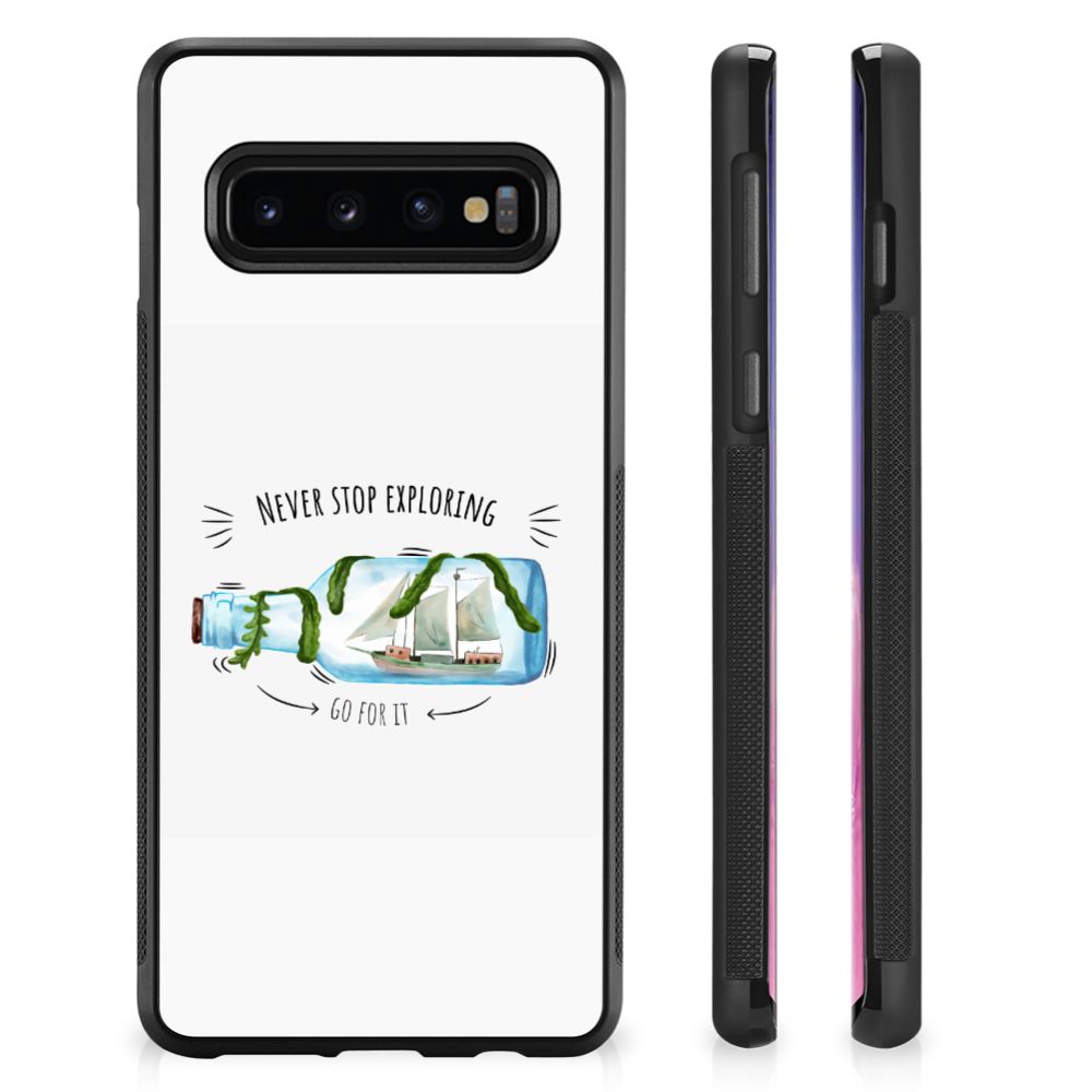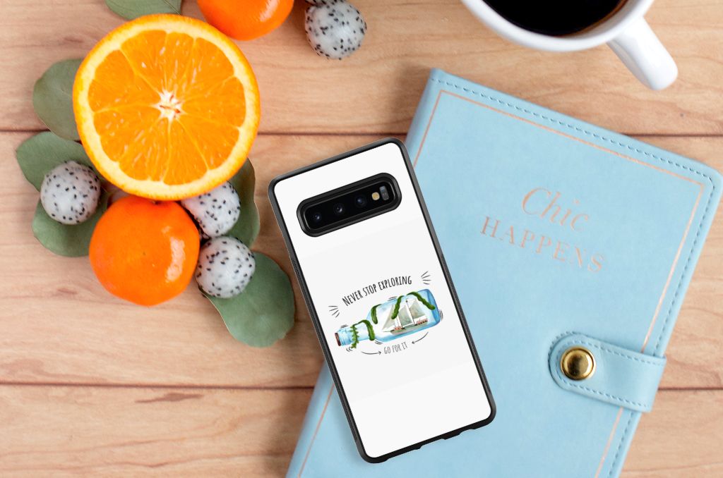 Dit leuke design met een schip in een fles is voor de echte avonturier of reiziger. Dankzij de tekst ‘Never stop exploring: Go for it’ word je altijd herinnerd aan het feit dat het volgende avontuur weer op de loer ligt! Dit design staat op een Bumper Hoesje voor je Samsung Galaxy S10+. Een gripcase is voor mensen die van stevigheid houden. Het is een beetje een mix van een hardcase en een TPU hoesje. De achterkant is van een stevig materiaal gemaakt, dat wordt bedrukt met het design. De zijkanten hebben een subtiele en mooie textuur, voor meer grip. De inkt die we gebruiken kan in het begin een sterke geur afgeven. Dit is echter tijdelijk en niet schadelijk voor de gezondheid. Na een kleine week verdwijnt de geur vanzelf.