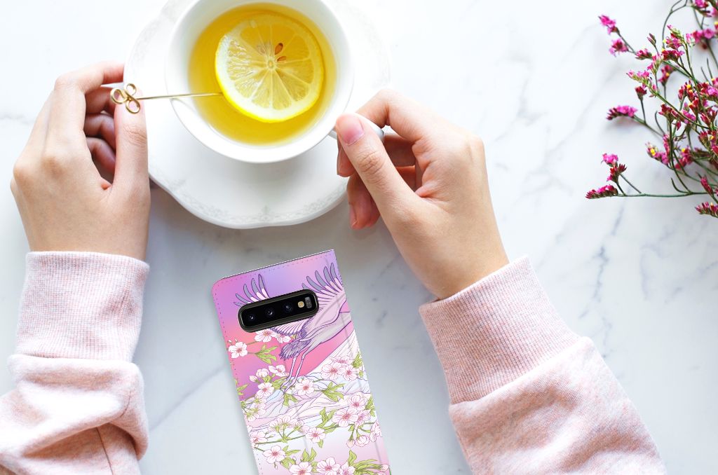 Met deze opvallende en kleurrijke Samsung Galaxy S10 Hoesje maken met Bird Flying design blijft jouw toestel in uitzonderlijke staat. Een ooievaar fleurt al sinds mensenheugenis dorpen en steden op en doet dit ook met jouw stand case. Het design hoesje met deze reigerachtige vogel in roze en paarse kleuren is een zeer goede bescherming voor je telefoon. Het spetterende stand hoesje met opvallende ooievaar beschermt jouw telefoon aan alle zijden en beschikt over een opbergvakje voor een pasje of briefgeld. De roze met paarse case sluit perfect af met de magneet aan de binnenzijde. De houder aan de binnenzijde van het schitterende stand hoesje is van TPU. Dit is ook nog eens zeer flexibel materiaal. Het pu leer aan de buitenkant oogt zeer chique. Kijk voor andere dieren op een design hoesje binnen deze fraaie collectie. Ook kun je zelf een hoesje ontwerpen met je favoriete huisdier.