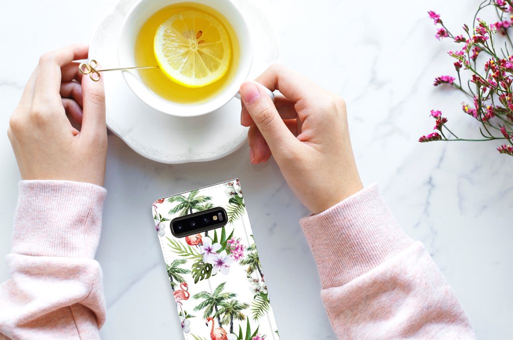 Een Samsung Galaxy S10 Hoesje maken met Flamingo Palms is in vele opzichten bijzonder. De rode flamingo op het hoesje kent zijn oorsprong in het Caraïbische gebied. Stel dat je in deze regio vakantie aan het vieren bent, dan val je zonder meer op met dit hoesje met flamingo’s en palmbomen. Dit hoesje biedt bescherming voor alle zijden van je telefoon. Jouw apparaat ligt goed opgeborgen in de TPU houder aan de binnenzijde en de buitenkant van het hoesje met flamingo’s en palmbomen heeft een magnetische sluiting. Ook de palmbomen op deze stand case geven jou natuurlijk een ultiem vakantiegevoel. Het stand hoesje met flamingo’s en palmbomen heeft een vakje voor pasjes en een standaard en is op maat gemaakt.