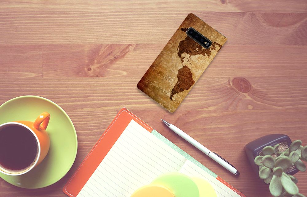 Als je een hoesje koopt met een wereldkaart, kun jij op veilige wijze met je smartphone rond de wereld reizen. Ga je zonder een boekhoesje met wereldkaart het buitenland verkennen, dan loop je veel te groot risico dat je stukken krijgt aan je smartphone. Met als gevolg dat je de belangrijke gebeurtenissen op je reis wellicht niet meer vast kunt leggen om door te sturen aan je vrienden. In het slechtste geval wordt jouw toestel zonder een smartphone hoesje met wereldkaart onbruikbaar. Wij kunnen de wereldkaart bedrukken op een stand case. Een Samsung Galaxy S10 Plus Book Cover beschermt jouw telefoon aan alle kanten en beschikt over een 1 opbergvakje en een speciale standaard. Het hoesje wordt afgesloten met een magneet aan de binnenzijde. De houder aan de binnenzijde is van TPU. Dit stand hoesje met wereldkaart is voor een zeer laag bedrag te bestellen.