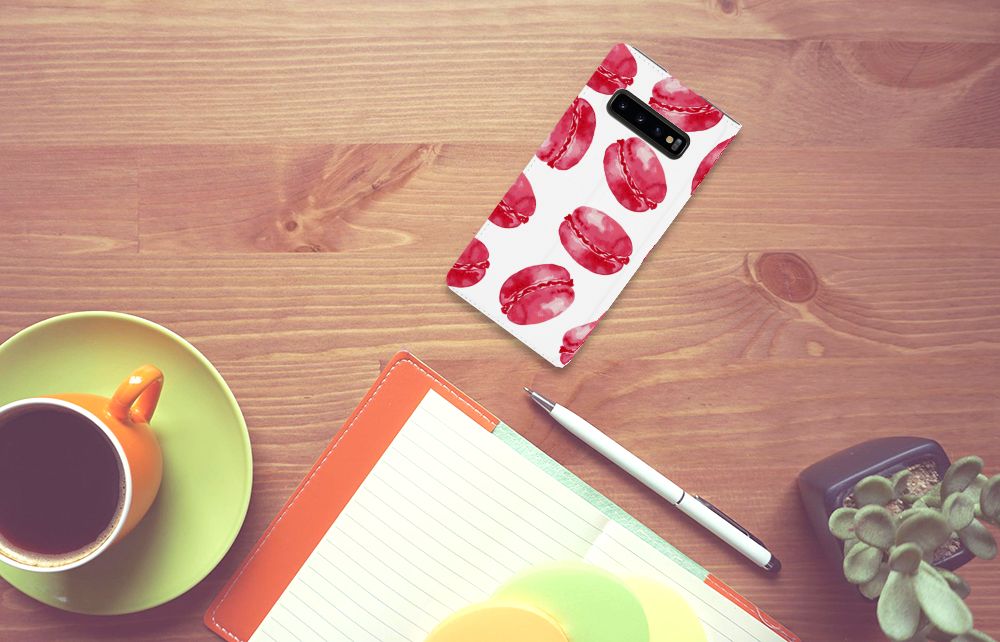 Dit stand hoesje met Pink Macarons is een zeer opvallende bescherming voor jouw smartphone. Macarons zijn Franse koekjes: kleine, rond en luchtig. Ze worden in veel verschillende smaken gemaakt, herkenbaar aan de verschillende kleuren zoals chocolade (donkerbruin), mokka (middenbruin), kersen (rood), pistache (groen), aardbei (roze), framboos (karmijn). Deze kleuren kun je net allemaal zien op dit fraaie design hoesje met roze macarons. Heb je altijd al een Samsung Galaxy S10 Plus Flip Style Cover willen hebben met roze macarons? Grijp dan nu je kans. Deze case heeft zeer veel goede eigenschappen, zoals 1 opbergvakje en een magnetische sluiting aan de binnenkant. Dit design hoesje met roze macarons wordt aan alle zijden bedrukt. De houder aan de binnenkant van het hoesje is van TPU. De case heeft ook een handige standaard.