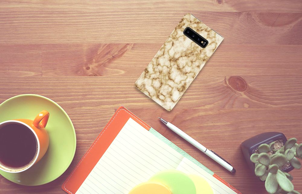 Deze Samsung Galaxy S10 Plus Standcase met Marmer Goud is het waard om een blokje voor om te rijden. Dit is overigens niet nodig. Als je het hoesje met goud marmer nu bestelt heb je het zeer snel in huis. Je kunt er bij wijze van spreken thuis op gaan zitten wachten. Je hebt diverse soorten marmer. We hebben enkele fraaie kleuren op onze hoesjes gezet, zoals in dit geval het gouden marmer. Het gouden marmer wordt bedrukt op alle zijden van de stand case, die beschikt over een vakje voor pasjes of briefgeld en een magnetische sluiting aan de binnenzijde. Verder heeft de case met goud marmer een houder van TPU. De rijkheid aan kleuren en variaties in afwerking is een schitterende eigenschap van marmer. Dit stand hoesje met goud marmer heeft ook veel schitterende eigenschappen en is de ideale bescherming voor jouw smartphone.