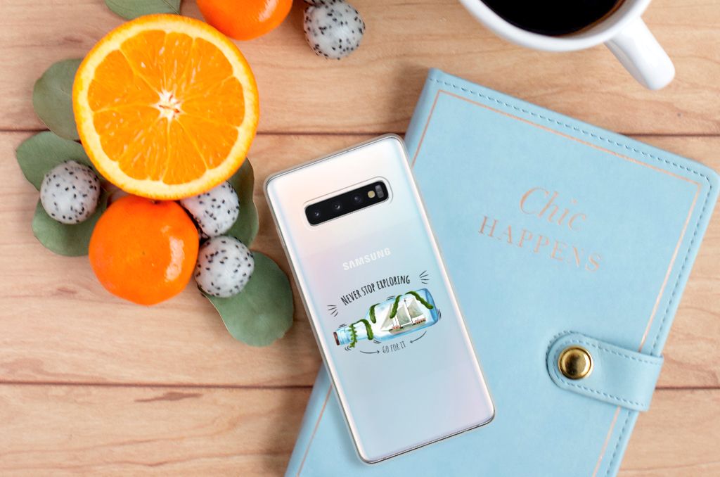 Dit leuke design met een schip in een fles is voor de echte avonturier of reiziger. Dankzij de tekst ‘Never stop exploring: Go for it’ word je altijd herinnerd aan het feit dat het volgende avontuur weer op de loer ligt! Dit design staat op een Telefoonhoesje met Naam voor je Samsung Galaxy S10 Plus. TPU is flexibel en heel erg sterk. Zo is je telefoon aan de achterkant en de randen heel goed beschermd. De case is aan de bovenkant bedrukt, de randen blijven transparant. Het TPU-hoesje is perfect te combineren met een screenprotector, zo zijn je telefoon en je beeldscherm altijd goed beschermd.