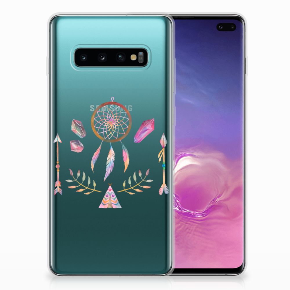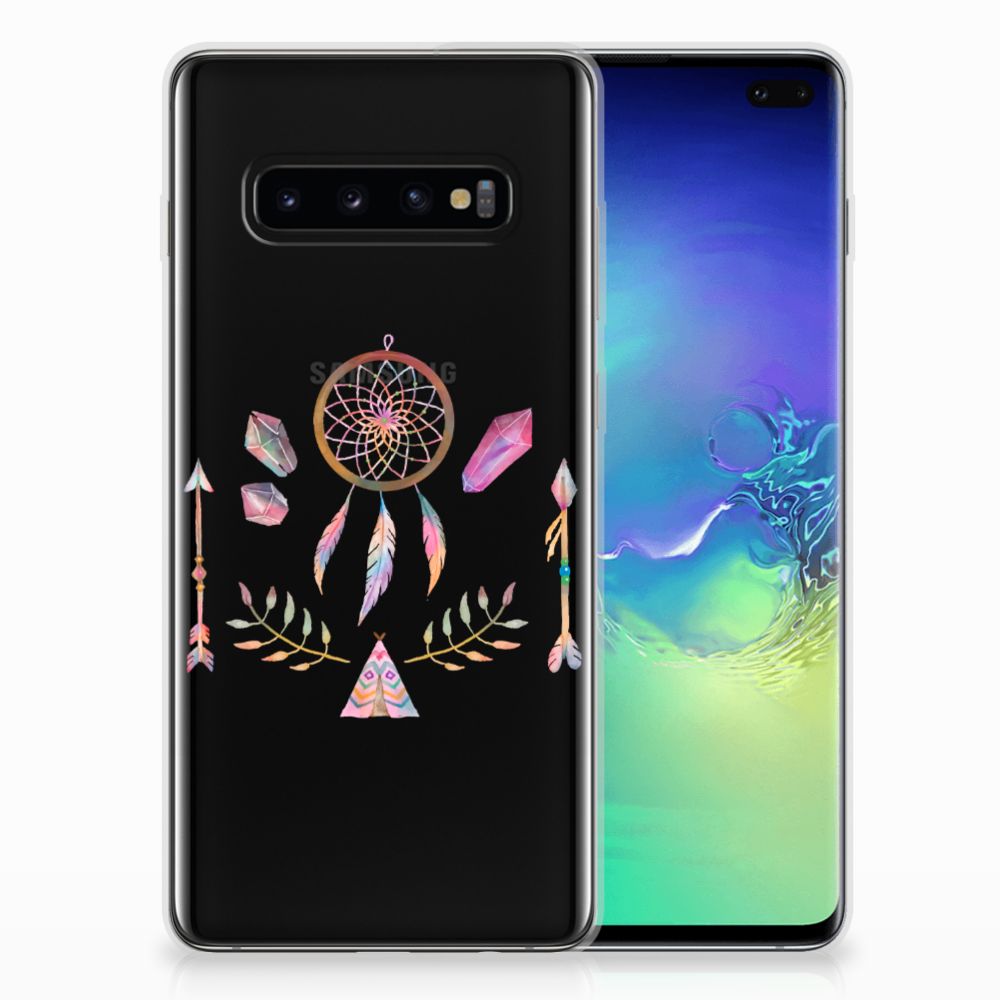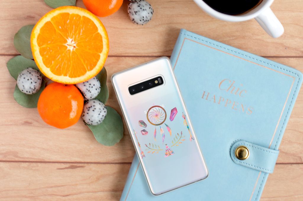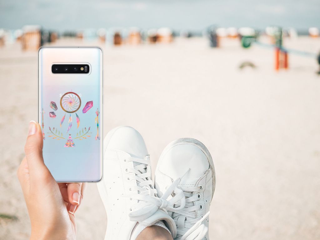 Een dromenvanger werd lang geleden al door een indianenvolk in Noord-Amerika gebruikt om nare dromen te weren. Nu nog hangen mensen over de hele wereld dromenvangers boven hun bed. Maar ook op een telefoonhoesje staat zo’n boho dreamcatcher heel mooi. Dit mooie design dat bestaat uit een tipi, pijlen en dromenvanger heeft veel verschillende prachtige kleuren. Maar omdat het ontwerp minimalistisch en klein is, is het design toch subtiel te noemen. Dit ontwerp staat op een Telefoonhoesje met Naam voor je Samsung Galaxy S10 Plus. TPU is flexibel en heel erg sterk. Zo is je telefoon aan de achterkant en de randen heel goed beschermd. De case is aan de bovenkant bedrukt, de randen blijven transparant. Het TPU-hoesje is perfect te combineren met een screenprotector, zo zijn je telefoon en je beeldscherm altijd goed beschermd.