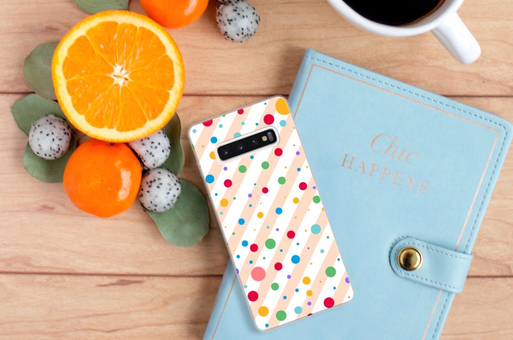Een Samsung Galaxy S10 Plus TPU bumper met verschillende kleuren stippen is een schitterende bescherming van jouw smartphone. De tpu case met het design Dots in alle kleuren van de regenboog komt voor jou als geroepen. Maak je geen gebruik van dit zeer mooie hoesje, dan kan het met jouw smartphone een beetje beroerd aflopen. Deze mooie tpu case met verschillende soorten klompen in verschillende kleuren is zo’n beetje de meest flexibele case die er bestaat. Het hoesje met stippen zorgt voor een goede bescherming van je smartphone, vooral aan de achterzijde en zijkanten. Met een tpu hoesje met stippen in verschillende kleuren blijft jouw gsm volledig in tact. Heb je liever een tpu case met stippen in andere opvallende kleuren? Ontwerp dan zelf een tpu case met je eigen foto’s en teksten! De case wordt aan de achterzijde bedrukt met klompen, de zijkanten blijven doorzichtig.