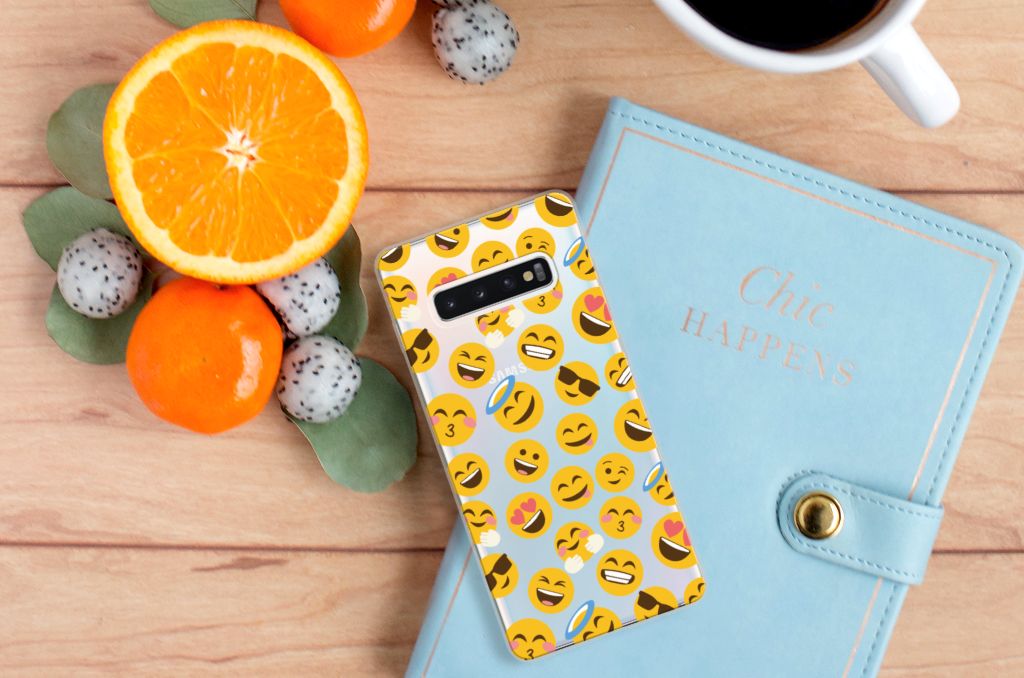 Je gebruikt ze waarschijnlijk dagelijks: emoji’s. Daarom hebben we besloten ze op een design hoesje te zetten. De kleurrijke, vaak gele emoticons maken chatberichten net wat spontaner. Dat hebben we allemaal te danken aan Japan, waar de emoji’s die we zo goed kennen vandaan komen. Ondertussen zijn er meer dan 1800! Deze passen natuurlijk niet allemaal op een Samsung Galaxy S10 Plus TPU bumper, maar we hebben de meeste gebruikte exemplaren erop gezet. Deze tpu case is voorzien van opstaande randen zodat het touchscreen van je telefoon beter is beschermd. Super handig. Het TPU zelf is zeer flexibel en is op maat gemaakt. We gebruiken emoji’s vaak om complete woorden te vervangen. Dit smartphone hoesje zegt dan ook meer dan duizend woorden kunnen. De tpu case wordt alleen aan de bovenzijde bedrukt met emoji’s. De zijkanten van de case worden niet bedrukt en blijven transparant.