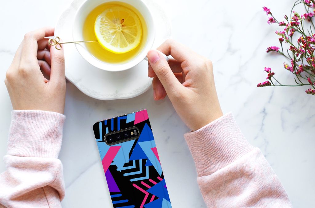 Dit fraaie hoesje met het design Funky Triangle is alles behalve eenvoudig en sober. Dat komt goed uit, want je hebt natuurlijk ook geen doorsnee telefoon gekocht. Mocht je dat wel hebben gedaan, dan wordt hij meteen speciaal als je een Samsung Galaxy S10 Stand Case koopt voor een spotprijsje. Een ding is zeker: opvallen ga je beslist met dit hoesje met paarse, roze en blauwe driehoeken. Jij zult in je element zijn met dit design hoesje met paarse, roze en blauwe driehoeken, omdat het er schitterend uitziet en jouw telefoon perfect beschermt. Het smartphonehoesje beschermt jouw telefoon aan alle zijden en beschikt over 1 opbergvakje en een speciale standaard. Het hoesje wordt afgesloten met een magneet aan de binnenzijde. De houder aan de binnenzijde is van TPU. Alle zijden van de stand case worden bedrukt. De paarse, roze en blauwe driehoeken maken de case helemaal af.