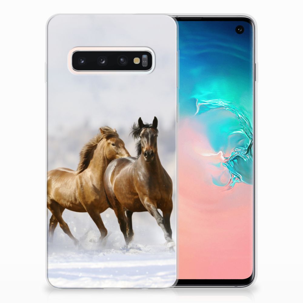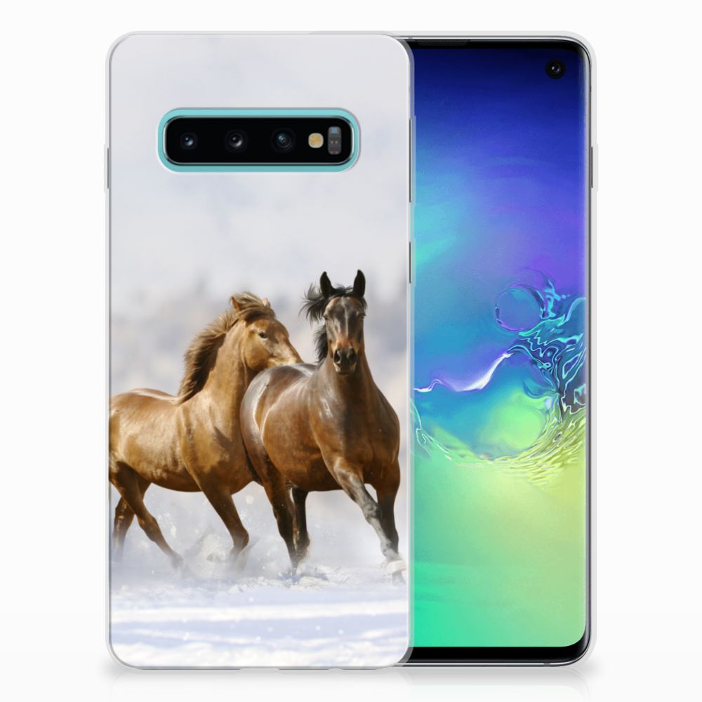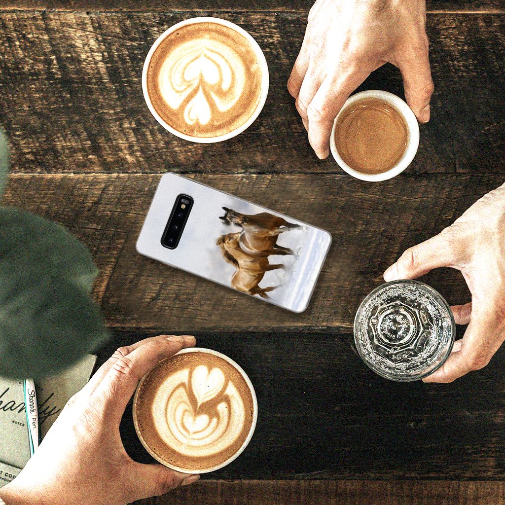 Voor de paardenliefhebbers onder ons hebben we onze collectie uitgebreid met dit design hoesje met print van paarden. Vroeger hield de mens vooral werkpaarden, inmiddels hebben we vriendschap gesloten met het paard. Vandaar dat het ook een favoriet dier is op onze smartphonehoesjes, zoals deze tpu case. Een TPU Hoesje voor de Samsung Galaxy S10 met Paarden is niet alleen super mooi en chique, maar ook nog eens zeer flexibel. Verder is de case schokabsorberend en heeft het opstaande randen. Zie je liever je eigen paard terug op een hoesje. Dat kan! Door zelf een uniek hoesje te ontwerpen, met eigen foto’s en teksten. De TPU case wordt aan de bovenzijde bedrukt, de zijkanten blijven transparant.