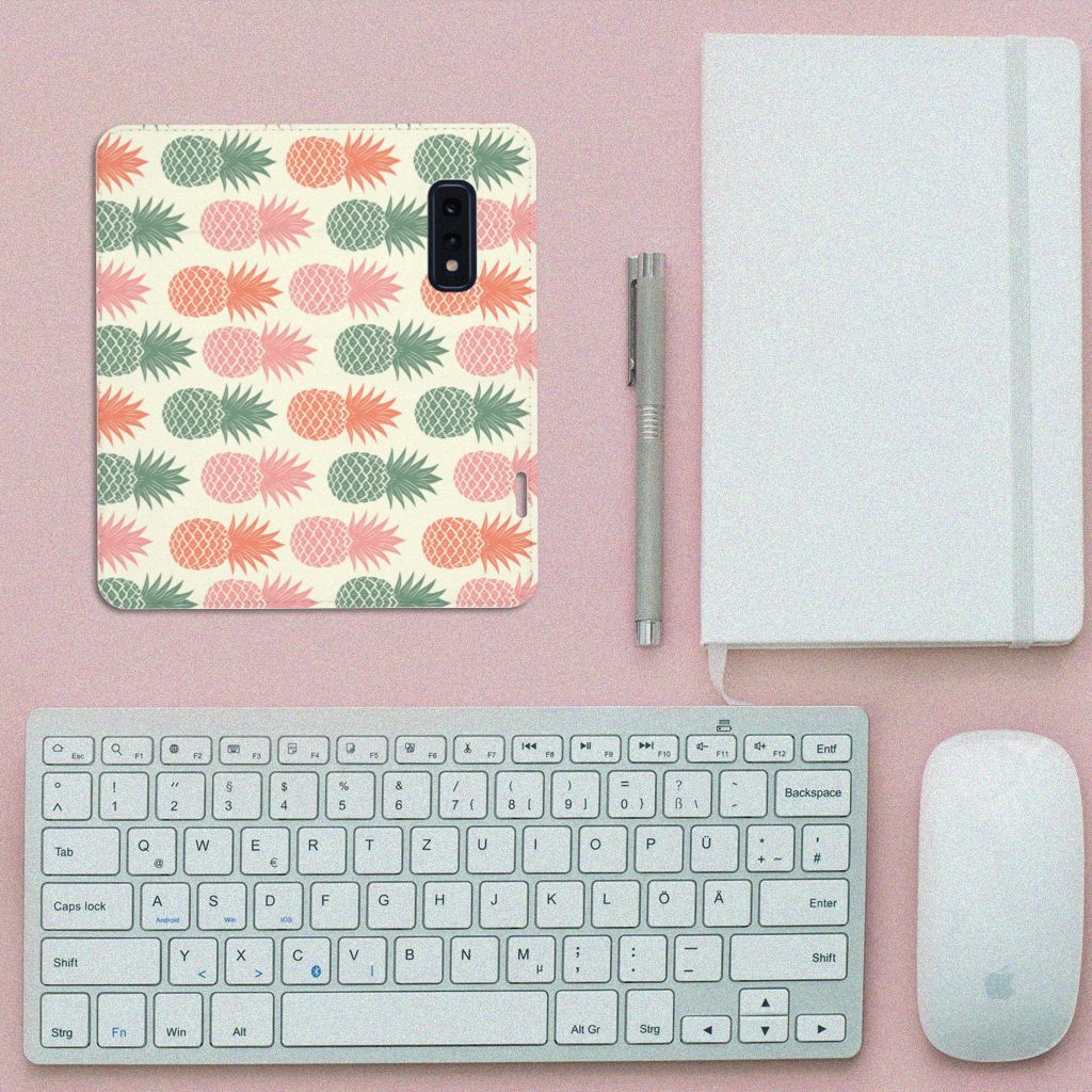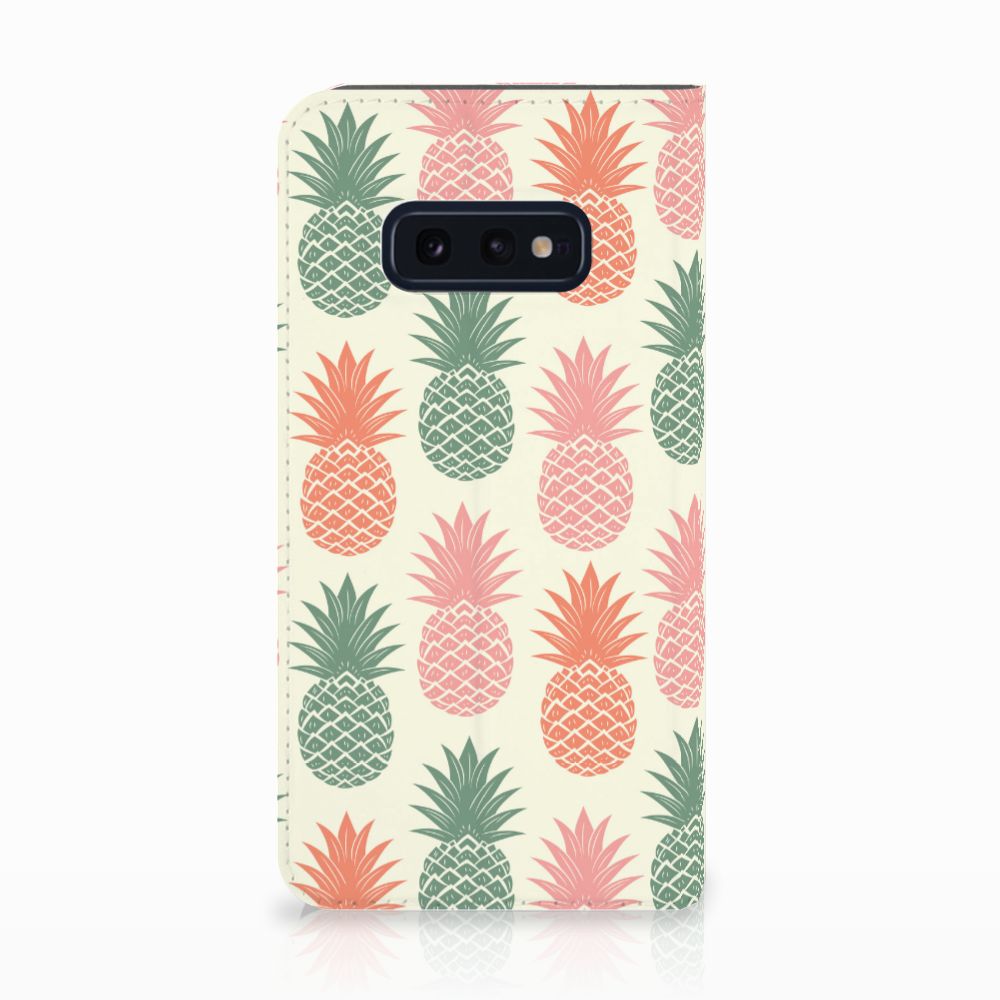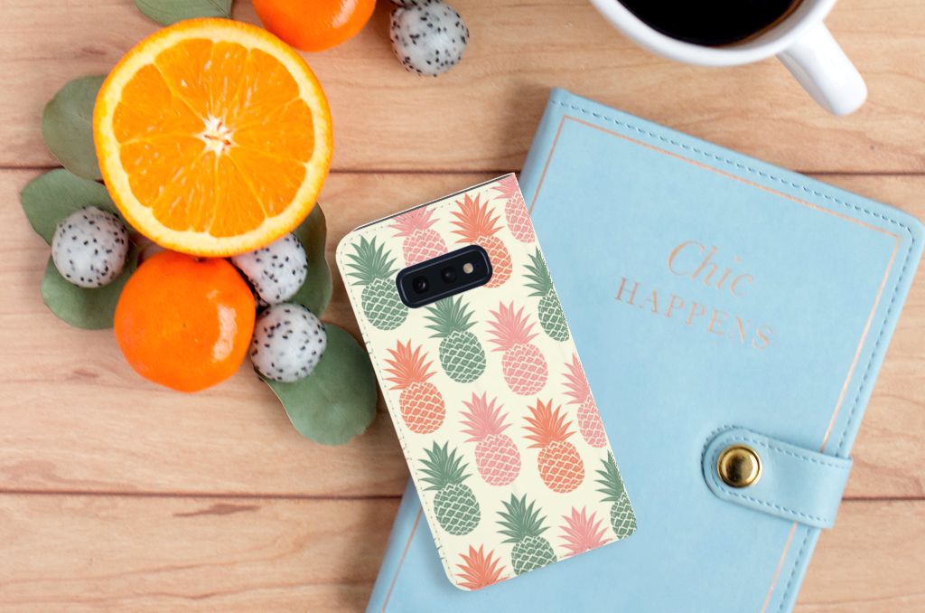Ananas is een woord uit het Tupi, de taal van de Tupi-indianen, en betekent uitmuntende vrucht. Dit fruit van zeer hoge kwaliteit staat op onze superieure boekhoesjes, stand cases, hard cases en TPU cases. Jij blijft er gezond uitzien als je zo nu en dan een hap neemt van een Ananas , jouw smartphone blijft tip top in orde als je er een leuk telefoonhoesje omheen doet. Een ananas heeft stevig, veerkrachtig vruchtvlees. Een beetje te vergelijken met het TPU in onze hoesjes. TPU is elastisch materiaal, dat zeer buigzaam is. Vandaar dat het zeer schokbestendig is. Het ananas design staat op een stand case. Deze Samsung Galaxy S10e Flip Style Cover beschermt jouw telefoon aan alle kanten en beschikt over een 1 opbergvakje en een speciale standaard. Het hoesje wordt afgesloten met een magneet aan de binnenzijde. De houder aan de binnenzijde is van TPU.