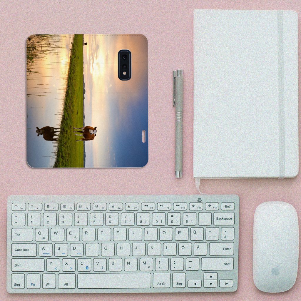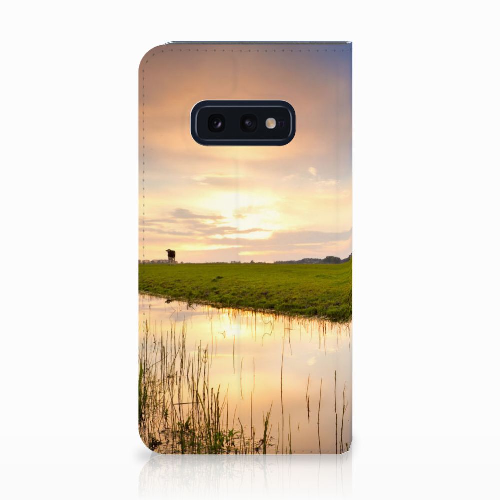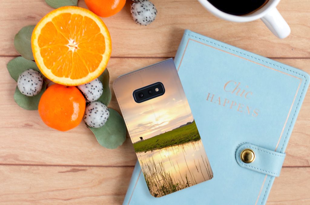 Het levert een idyllisch plaatje op, dit hoesje met een koe en ondergaande zon op de achtergrond. Door een koe buiten te laten lopen en grazen, hebben ze minder kans om ziek te worden. De Koe graast het liefst met soortgenoten, al zijn deze een stukje van de koe op de case verwijderd. Dit levert ook een mooi plaatje op, zoals je kunt zien op dit design hoesje. Deze stand case ziet er strak uit en is voorzien van verschillende uitsparingen. Een Samsung Galaxy S10e Hoesje maken met magneet aan de binnenzijde beschermt jouw smartphone overal. Alle zijden zijn bedrukt. Koeien hebben lange graasperioden nodig, afgewisseld door rust- en herkauwperioden. Zo goed als grazen voelt voor koeien, zo lang zal jouw design hoesje meegaan. De binnenkant van de stand case is van TPU, de buitenzijde van leer.
