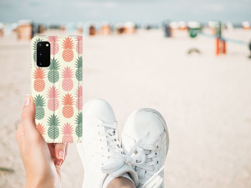 Ananas is een woord uit het Tupi, de taal van de Tupi-indianen, en betekent uitmuntende vrucht. Dit fruit van zeer hoge kwaliteit staat op onze superieure boekhoesjes, stand cases, hard cases en TPU cases. Jij blijft er gezond uitzien als je zo nu en dan een hap neemt van een Ananas , jouw smartphone blijft tip top in orde als je er een leuk telefoonhoesje omheen doet. Een ananas heeft stevig, veerkrachtig vruchtvlees. Een beetje te vergelijken met het TPU in onze hoesjes. TPU is elastisch materiaal, dat zeer buigzaam is. Vandaar dat het zeer schokbestendig is. Het ananas design staat op een stand case. Deze Samsung Galaxy S20 Flip Style Cover beschermt jouw telefoon aan alle kanten en beschikt over een 1 opbergvakje en een speciale standaard. Het hoesje wordt afgesloten met een magneet aan de binnenzijde. De houder aan de binnenzijde is van TPU.