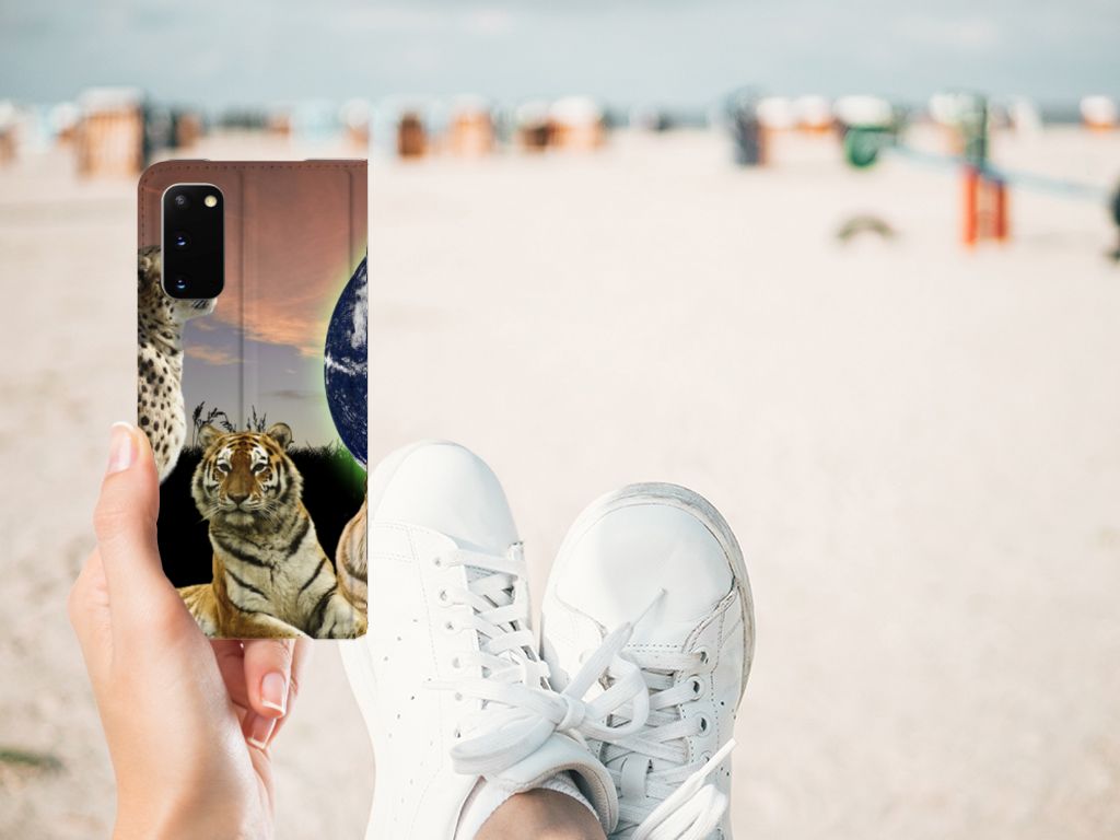 Deze standcase met roofdieren kan exclusief in het bezit van jou komen. Bovendien kun je hier zelf nog unieke teksten en/of beelden aan toevoegen. Je Hoesje maken krijgt dan een unieke identiteit. Roofdieren zoals tijgers op dit hoesje zijn voortdurend op zoek naar een geschikte prooi. De tijgers met aardbol op de achtergrond op deze stand case geven jouw Samsung Galaxy S20 een hele stoere uitstraling. Deze bijzondere case is van PU-leer (buitenzijde) en TPU (binnenzijde) en beschikt over een houder en een speciale standaard. Verder is deze stand case met roofdieren voorzien van een magnetische sluiting aan de binnenzijde. Je zorgt voor de perfecte bescherming van je smartphone met dit design hoesje met roofdieren met aardbol op de achtergrond.