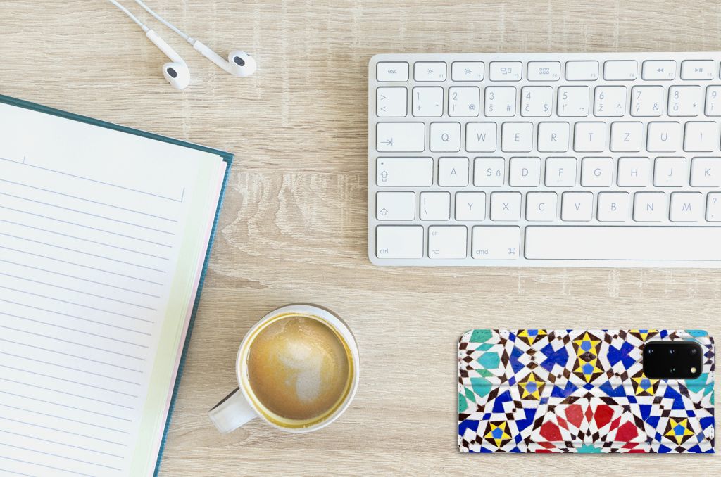 Aan design hoesjes met kunstvormen geen gebrek in onze uitgebreide collectie. Wat dacht je van dit design hoesje met Mozaïek . Dit is een kunstvorm waarbij een grote afbeelding wordt gemaakt uit een groot aantal kleine gekleurde steentjes (tesserae), die in een vloer of wand worden gemetseld. Deze gekleurde steentjes zie je terug op deze stand case met design van mozaïek. Een stand case is een van de veiligste cases die er bestaan. Een Samsung Galaxy S20 Plus Standcase met print zorgt voor een volledige bescherming van je smartphone en wordt aan alle zijden bedrukt met mozaïek. Verder is de houder aan de binnenzijde van TPU. De Grieken en Romeinen beheersten de kunst al. Op diverse plaatsen in Europa zijn mozaïeken teruggevonden die tot op de dag van vandaag goed bewaard zijn gebleven. Met een hoesje met mozaïek blijft jouw telefoon in tact. Je pasje en kun je in het vakje aan de binnenzijde stoppen. De case heeft ook een standaard.