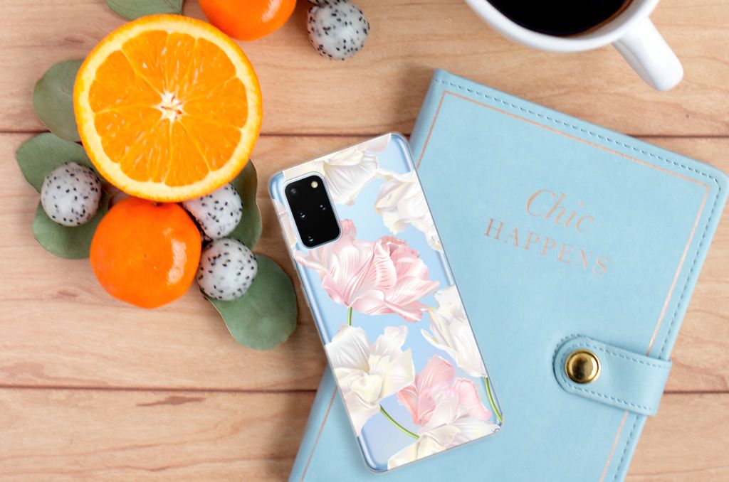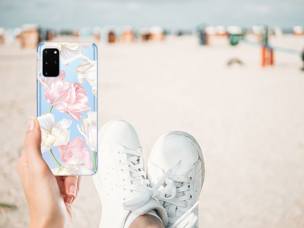 Een bosje bloemen doet een mens (en zijn smartphone) goed. De witte en roze bloemen op deze Samsung Galaxy S20 Plus TPU Case geven jouw smartphone een zeer mooie uitstraling. Je wordt er ook meteen een stuk rustiger van als je aan het appen of aan het bellen bent. Valt dan je telefoon op de grond, dan zal er dankzij de tpu case met het design Lovely Flowers ontstaan. Helemaal niet als je er een screenprotector bij hebt gekocht. Onze tpu cases met roze en witte bloemen zien er zeer prettig uit en zijn heel praktisch, getuige onder meer de opstaande randen en het flexibele materiaal. Alleen de achterkant van de tpu case wordt bedrukt met roze en witte bloemen. Op deze tpu case kun je trouwens ook een eigen ontwerp zetten. In een paar simpele stappen ontwerp je zelf een stand case met daarop jouw favoriete bloemen.