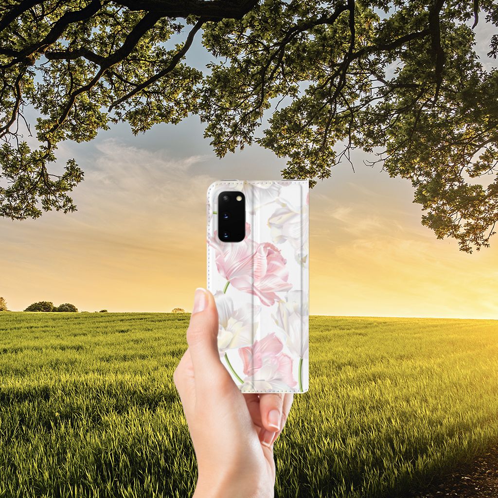 Een bosje bloemen doet een mens (en zijn smartphone) goed. De witte en roze bloemen op dit Samsung Galaxy S20 Smart Cover geven jouw smartphone een zeer mooie uitstraling. Je wordt er ook meteen een stuk rustiger van als je aan het appen of aan het bellen bent. Valt dan je telefoon op de grond, dan zal er dankzij de stand case met het design Lovely Flowers ontstaan. Onze stand cases met roze en witte bloemen zien er zeer prettig uit en zijn heel praktisch, wat blijkt uit onder meer het vakje aan de binnenkant en de handige standaard waarmee je de smartphone rechtop op tafel neer kunt zetten. De roze en witte bloemen passen goed op alle zijden van de case. Op deze stand case van leer en TPU (houder aan de binnenkant) kun je trouwens ook je eigen bloemige ontwerp zetten. In een paar simpele stappen maak je zelf een stand hoesje met daarop jouw mooiste bloemen.