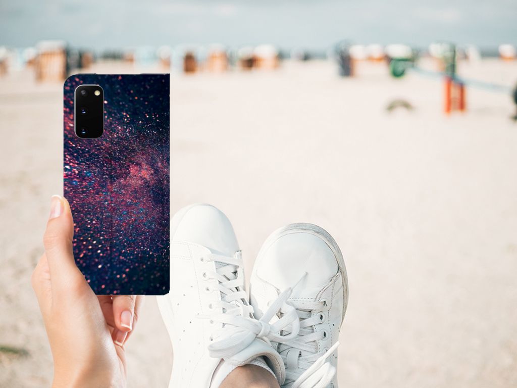 Je waant je in de zevende hemel met dit kunstzinnige, glitterachtige design hoesje met paarse en blauwe kleuren tegen een inktzwarte achtergrond. Het smartphone hoesje heeft ook een wat science fiction achtige allure. Met deze design Stars case zul je zeker opvallen. Als dit je bedoeling is, bestel dat snel dit waanzinnig mooie product voor je Samsung Galaxy S20. Het telefoonhoesje is van alle gemakken voorzien en combineert een hele fraaie uitstraling met maximaal comfort. Bovendien is het gemaakt van zeer stevig en flexibel materiaal. Het unieke design, door B2C Telecom ontworpen, staat op een Stand Case. Deze case beschermt jouw telefoon aan alle kanten en beschikt over een 1 opbergvakje en een speciale standaard. Het hoesje wordt afgesloten met een magneet aan de binnenzijde. De houder aan de binnenzijde is van TPU.
