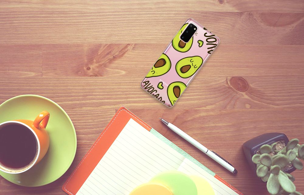 Avocado’s zijn niet alleen heel erg goed voor je, ze zijn ook super leuk op je telefoonhoesje. Dit unieke design vol schattige avocado’s zal jou en iedereen om je heen meteen opvrolijken. Nog een voordeel van dit design: deze avocado’s bederven nooit! Dit leuke Avocado Singing-ontwerp staat op een Telefoonhoesje met Naam voor de Samsung Galaxy S20. Met deze vrolijke groene vruchten op je hoesje val jij zeker op. TPU is flexibel en onbreekbaar. Zo is je telefoon aan de achterkant en de randen heel goed beschermd. De case is aan de bovenkant bedrukt, de randen blijven transparant. Het TPU-hoesje is perfect te combineren met een screenprotector, zo zijn je telefoon en je beeldscherm perfect beschermd.