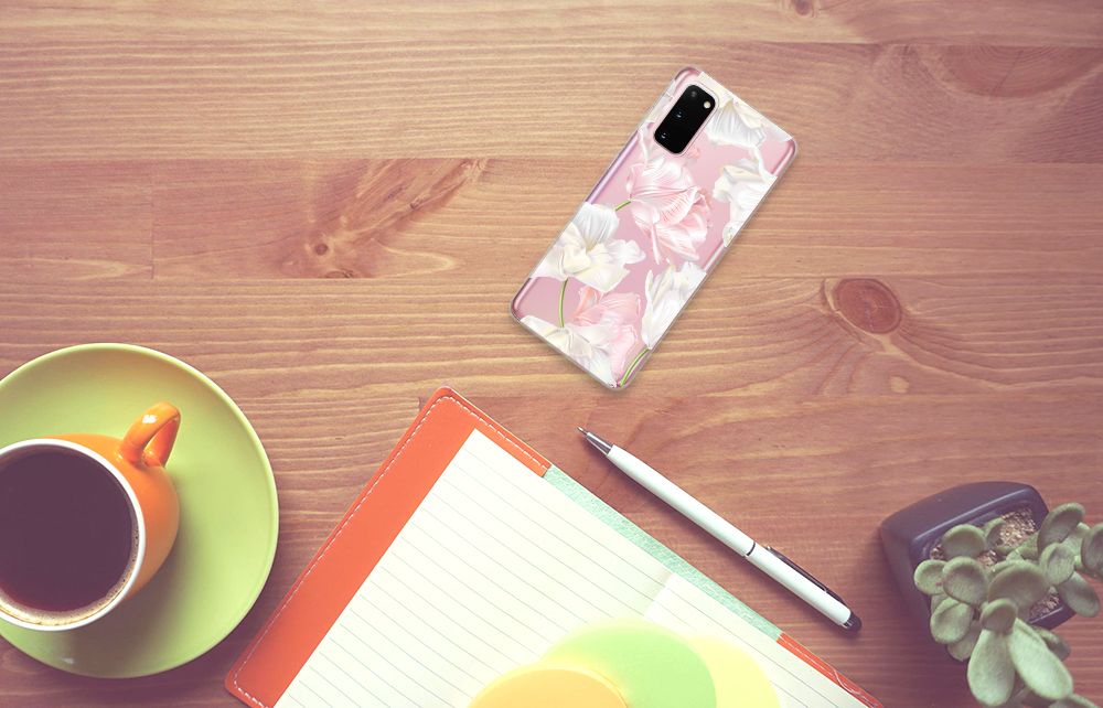 Een bosje bloemen doet een mens (en zijn smartphone) goed. De witte en roze bloemen op deze Samsung Galaxy S20 TPU Case geven jouw smartphone een zeer mooie uitstraling. Je wordt er ook meteen een stuk rustiger van als je aan het appen of aan het bellen bent. Valt dan je telefoon op de grond, dan zal er dankzij de tpu case met het design Lovely Flowers ontstaan. Helemaal niet als je er een screenprotector bij hebt gekocht. Onze tpu cases met roze en witte bloemen zien er zeer prettig uit en zijn heel praktisch, getuige onder meer de opstaande randen en het flexibele materiaal. Alleen de achterkant van de tpu case wordt bedrukt met roze en witte bloemen. Op deze tpu case kun je trouwens ook een eigen ontwerp zetten. In een paar simpele stappen ontwerp je zelf een stand case met daarop jouw favoriete bloemen.
