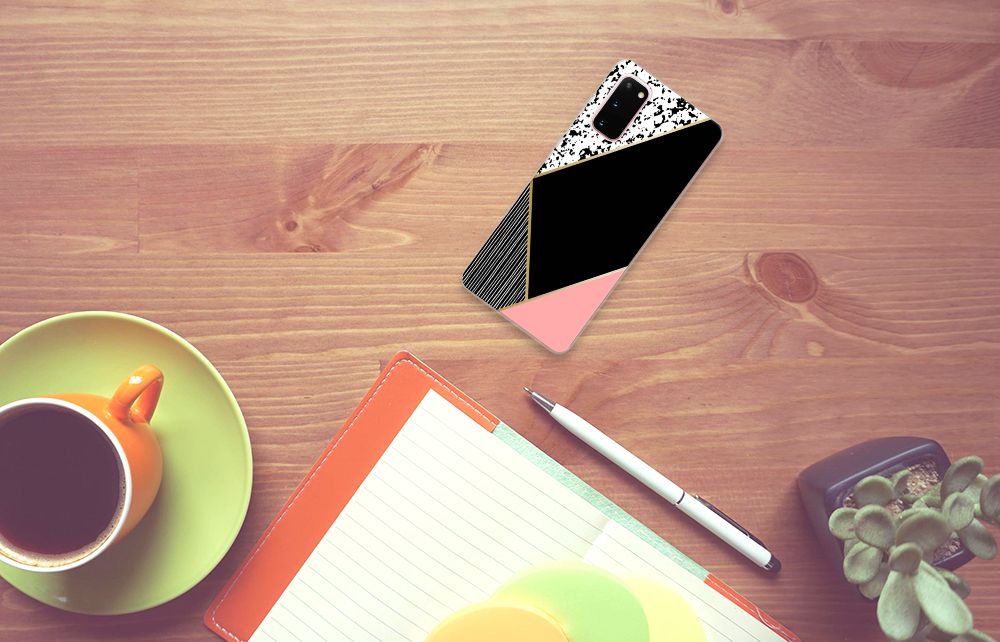 - Met een tpu-siliconen hoesje met roze, zwarte en witte vlakken blijft jouw telefoon in tact.