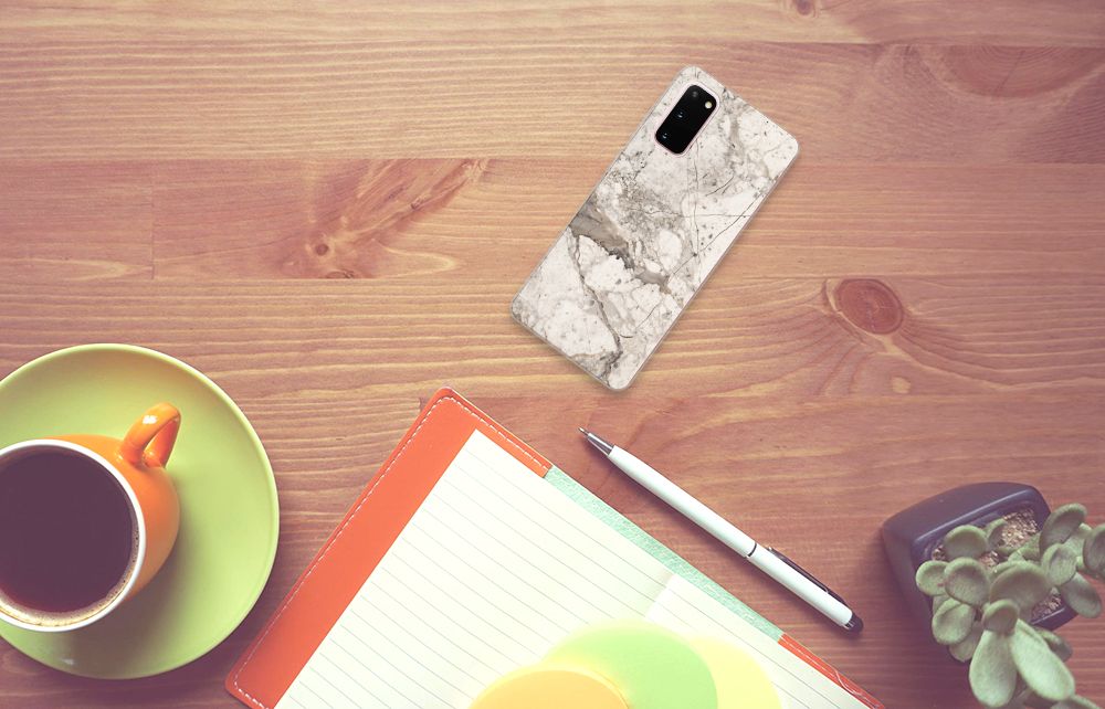 Dit design hoesje met Marmer Beige is voor de artistieke personen onder ons. De Grieken en Romeinen wisten het steen al te waarderen door het als bouw- en bekledingsmateriaal toe te passen. Naast het witte Carrara marmer met haar zacht grijze geaderde belijning zijn de diverse marmersoorten in een ruim kleurenpallet te krijgen. We hebben verschillende kleuren op design hoesjes gezet, zoals in dit geval beige marmer. Dit is een Samsung Galaxy S20 TPU Siliconen Hoesje met marmer in beige kleur. Het marmer wordt bedrukt op de voorkant van een tpu case, die beschikt over opstaande randen aan de voorkant en goed combineert met een screenprotector. De rijkheid aan kleuren en varianties in afwerking geeft designers de vrijheid om met marmer hele mooie architectonische projecten te realiseren. Wij hebben onze designer ook veel vrijheid gegeven. Het resultaat zie je terug in deze tpu case met beige marmer, die jouw smartphone goed beschermt. De zijkanten van de case worden niet bedrukt met marmer.