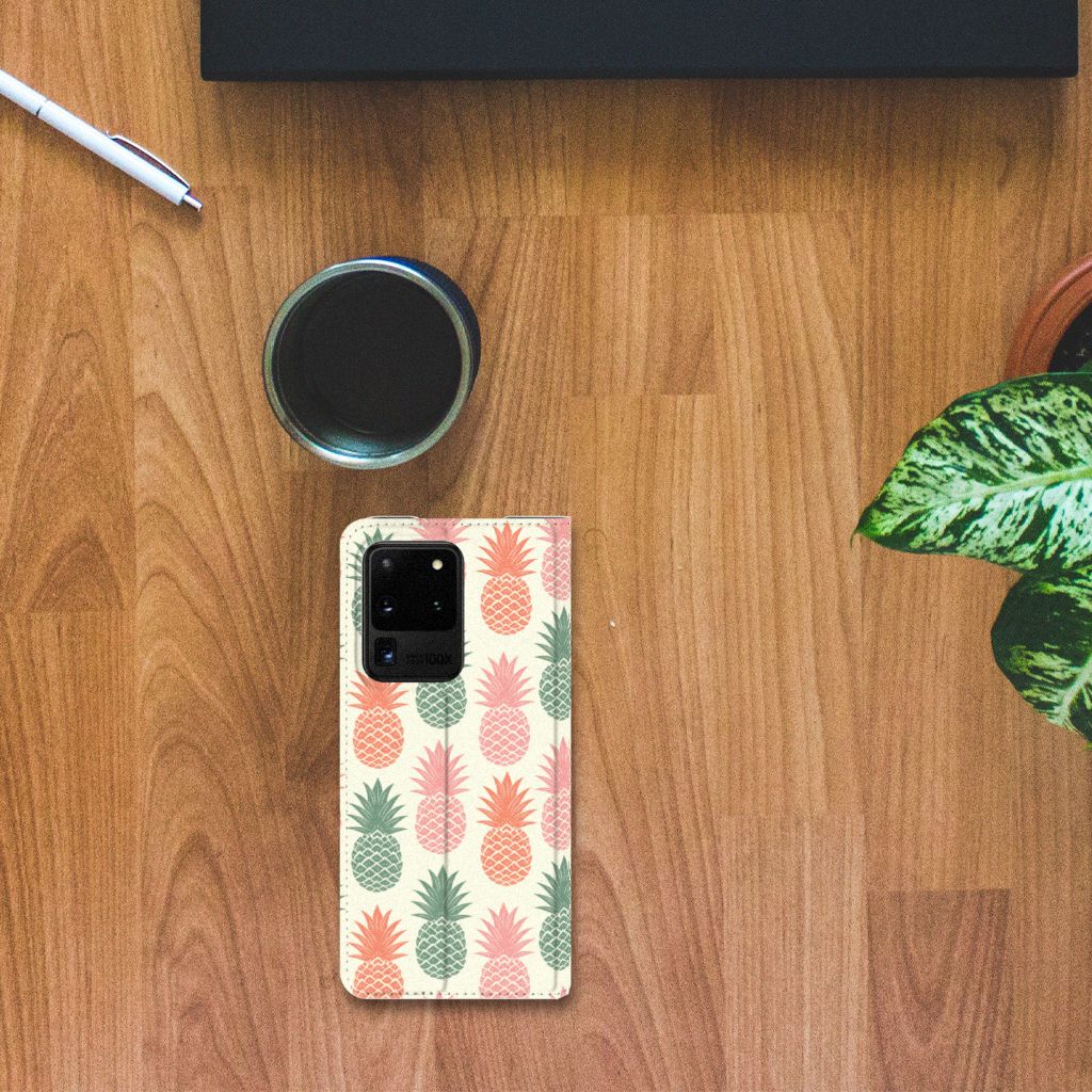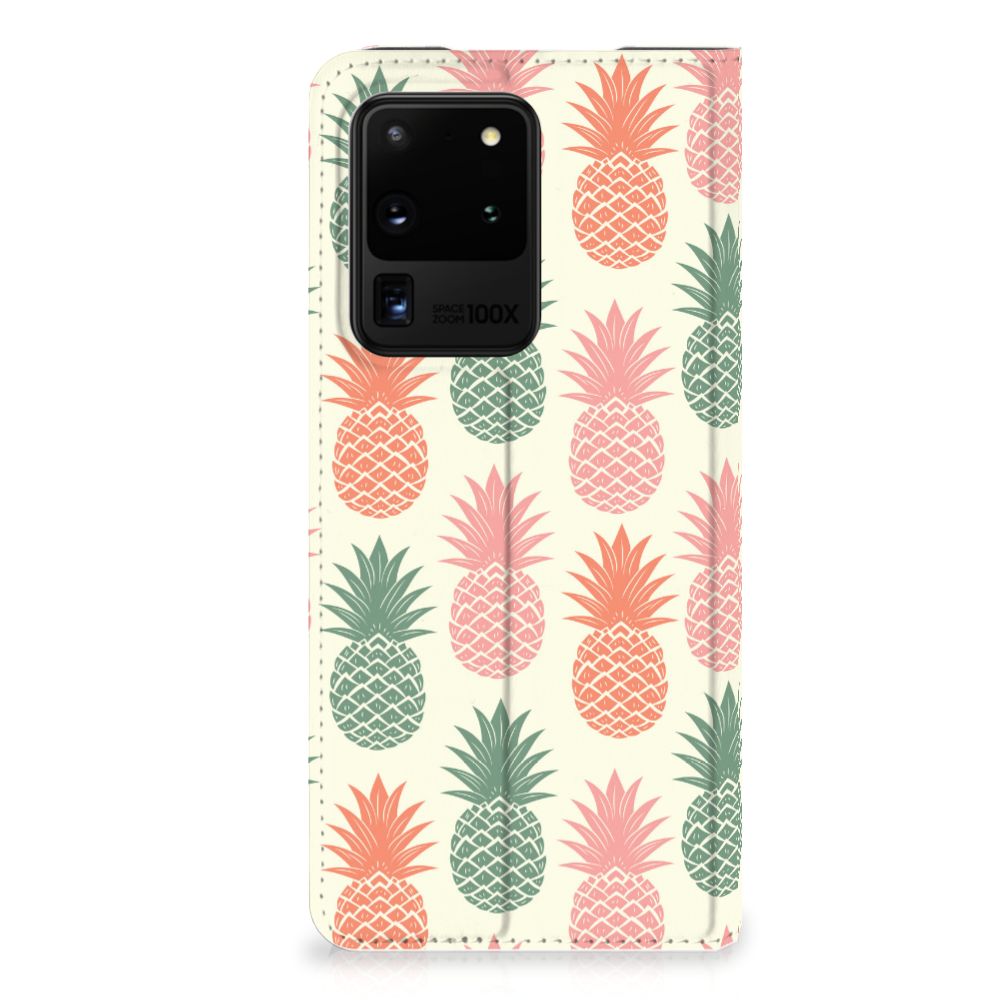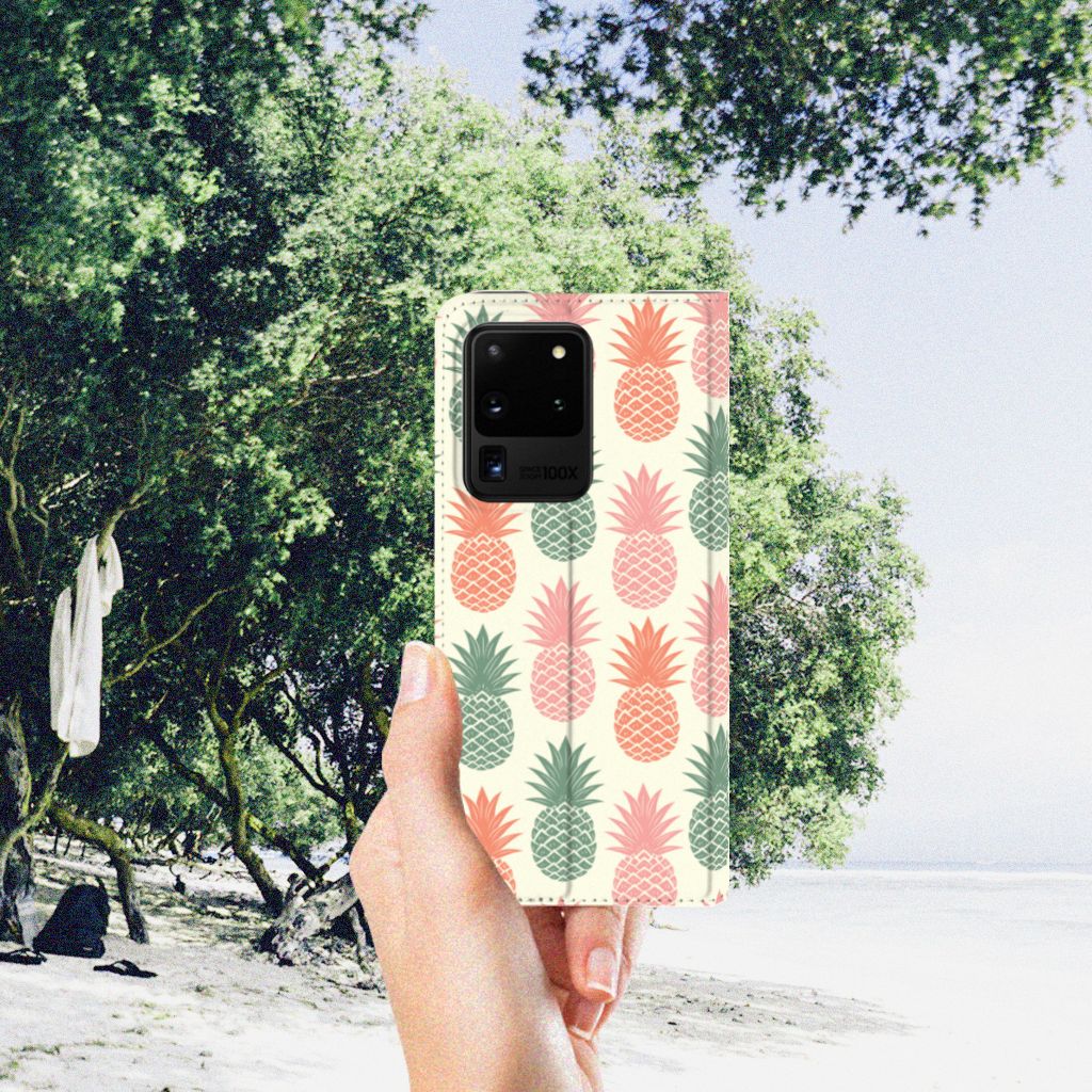 Ananas is een woord uit het Tupi, de taal van de Tupi-indianen, en betekent uitmuntende vrucht. Dit fruit van zeer hoge kwaliteit staat op onze superieure boekhoesjes, stand cases, hard cases en TPU cases. Jij blijft er gezond uitzien als je zo nu en dan een hap neemt van een Ananas , jouw smartphone blijft tip top in orde als je er een leuk telefoonhoesje omheen doet. Een ananas heeft stevig, veerkrachtig vruchtvlees. Een beetje te vergelijken met het TPU in onze hoesjes. TPU is elastisch materiaal, dat zeer buigzaam is. Vandaar dat het zeer schokbestendig is. Het ananas design staat op een stand case. Deze Samsung Galaxy S20 Ultra Flip Style Cover beschermt jouw telefoon aan alle kanten en beschikt over een 1 opbergvakje en een speciale standaard. Het hoesje wordt afgesloten met een magneet aan de binnenzijde. De houder aan de binnenzijde is van TPU.