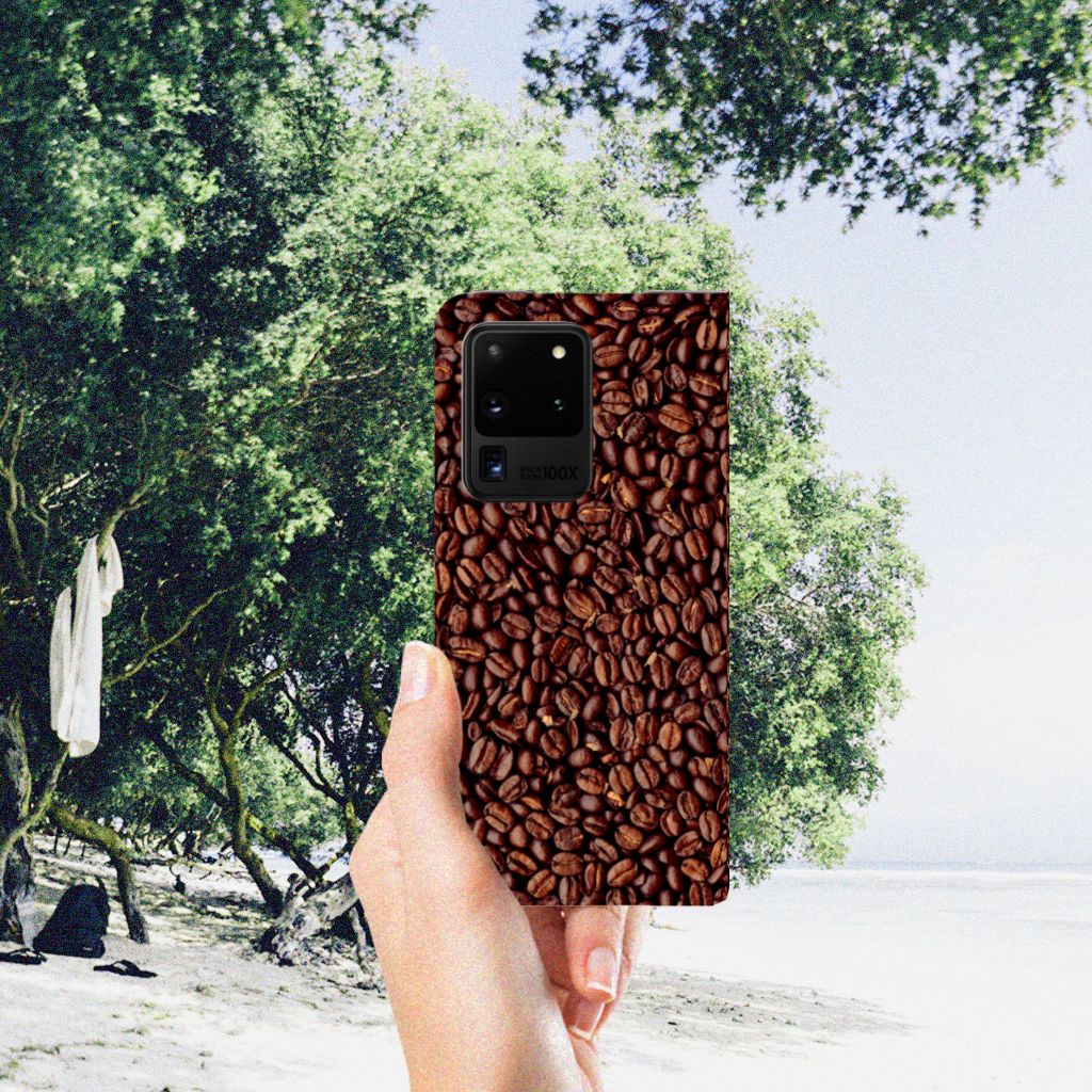 Als je de lekkerste koffie wilt dan kun je beste koffiebonen kopen. Koffie is namelijk het verst wanneer je de bonen zelf maalt. En wie houdt nou niet van de geur van vers gemaalde koffie? Daarom hebben wij de mooiste Koffiebonen op een smartphone hoesje gezet. Ben je barista, dan is dit het perfecte hoesje voor jouw werktelefoon. De koffiebonen staan op een stand case. Er is vrijwel geen betere bescherming dan dit hoesje, dat ook nog eens 1 opbergvakje heeft en een standaard. Je kunt leuk filmpjes kijken met een Samsung Galaxy S20 Ultra Flip Style Cover. Alle zijden van dit hoesje zijn bedrukt. Mensen die houden van een stevige espresso, kiezen voor dit degelijke design hoesje met bonen. Je kunt zelfs een eigen tekst toevoegen aan het design.