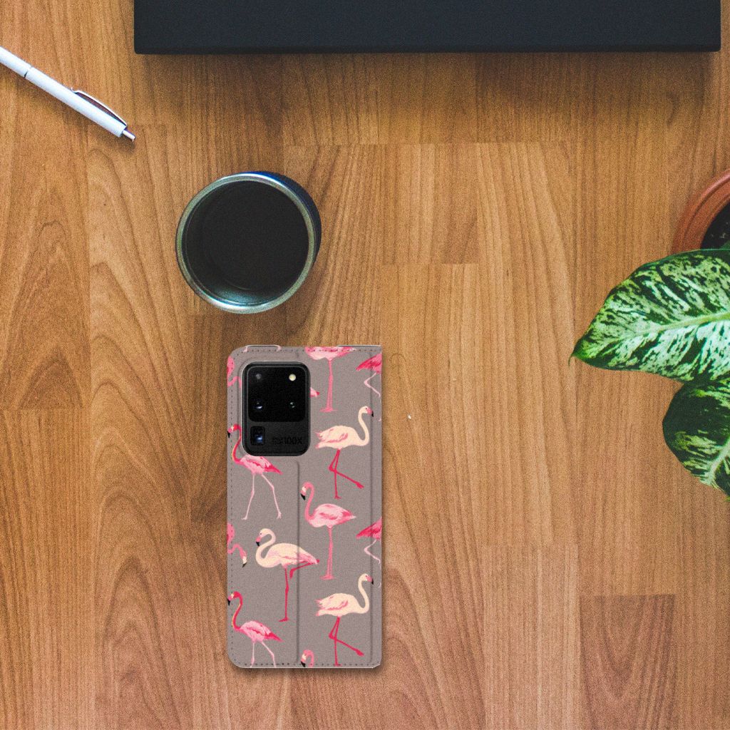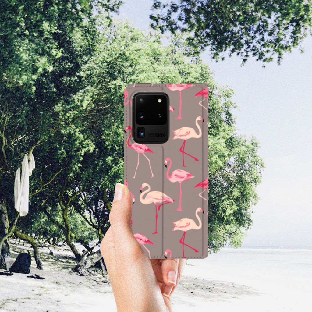 Een Samsung Galaxy S20 Ultra Hoesje maken met rode flamingo’s is in vele opzichten bijzonder. De rode flamingo op het hoesje komt oorspronkelijk uit het Caraïbische gebied. Stel dat je in deze regio vakantie viert, dan val je zonder meer op met dit hoesje met flamingo’s. Deze stand case biedt bescherming voor alle zijden van je telefoon. Jouw smartphone ligt goed opgeborgen in de TPU houder aan de binnenzijde en in dit gedeelte van het hoesje met flamingo’s zit de magnetische sluiting. De lichtroze flamingo, ook present op deze case, wordt tegenwoordig als aparte soort gezien naast de rode flamingo. De stand case met flamingo’s heeft vakjes voor pasjes en is op maat gemaakt.
