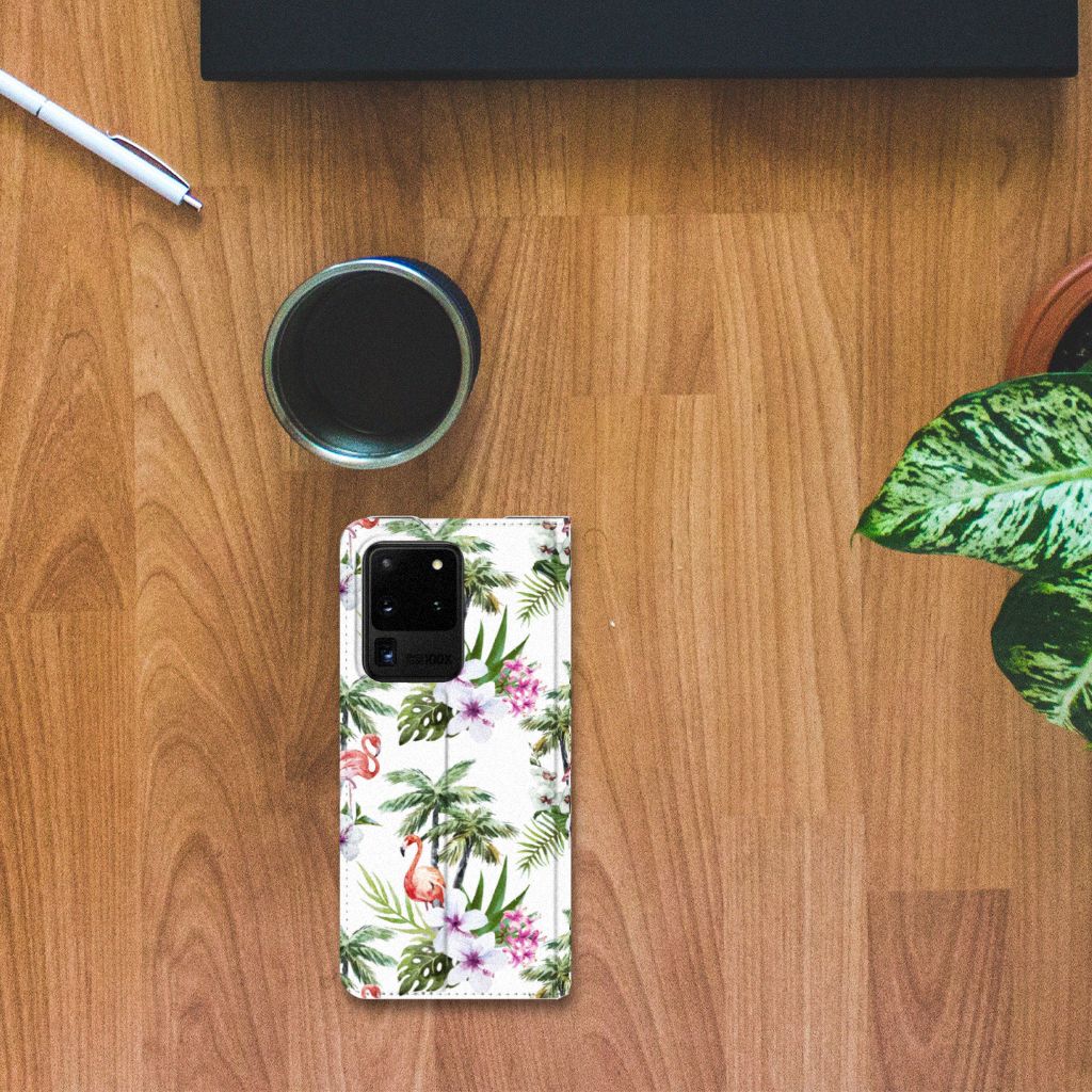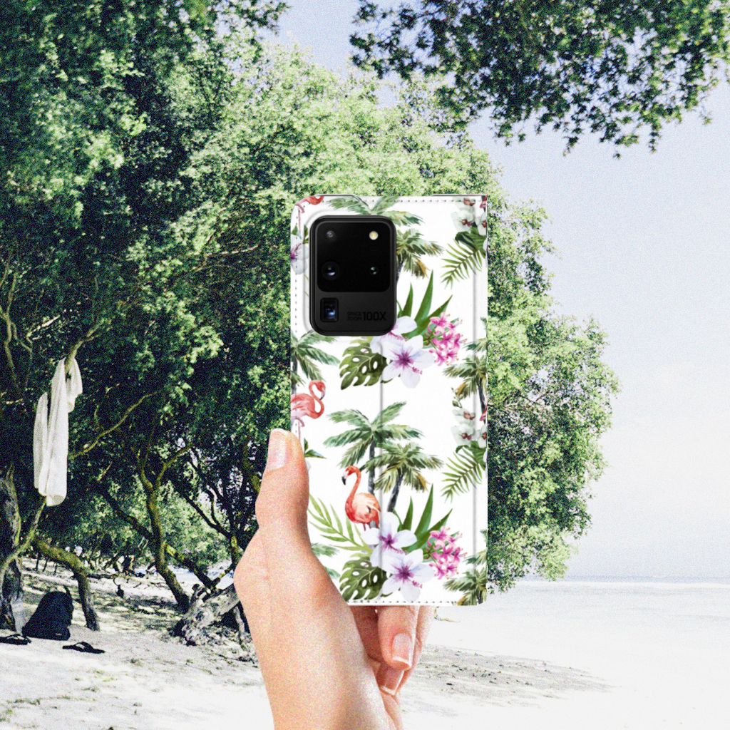 Een Samsung Galaxy S20 Ultra Hoesje maken met Flamingo Palms is in vele opzichten bijzonder. De rode flamingo op het hoesje kent zijn oorsprong in het Caraïbische gebied. Stel dat je in deze regio vakantie aan het vieren bent, dan val je zonder meer op met dit hoesje met flamingo’s en palmbomen. Dit hoesje biedt bescherming voor alle zijden van je telefoon. Jouw apparaat ligt goed opgeborgen in de TPU houder aan de binnenzijde en de buitenkant van het hoesje met flamingo’s en palmbomen heeft een magnetische sluiting. Ook de palmbomen op deze stand case geven jou natuurlijk een ultiem vakantiegevoel. Het stand hoesje met flamingo’s en palmbomen heeft een vakje voor pasjes en een standaard en is op maat gemaakt.