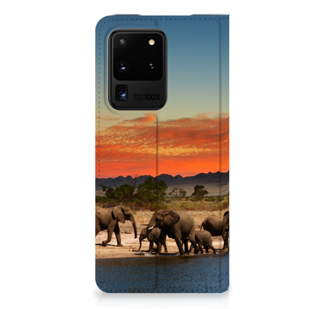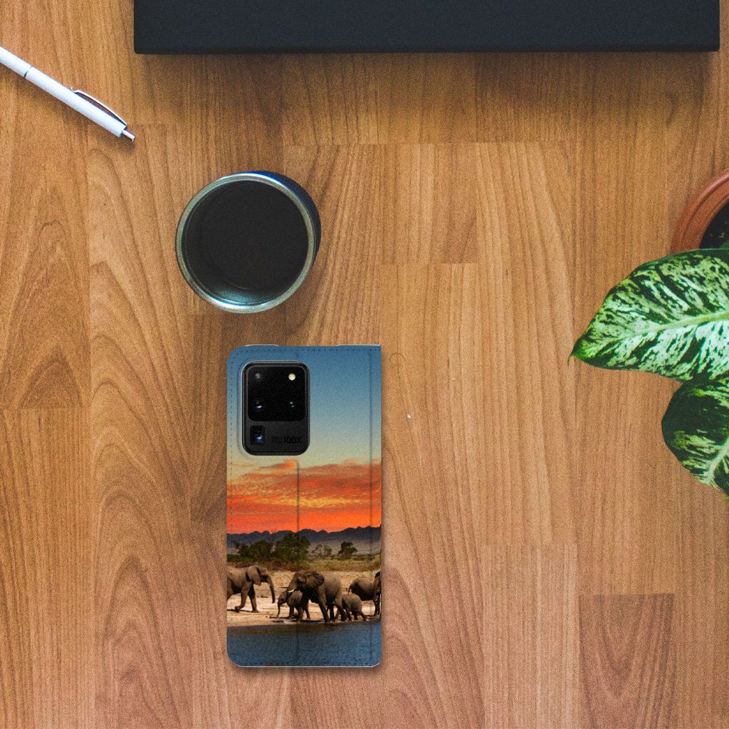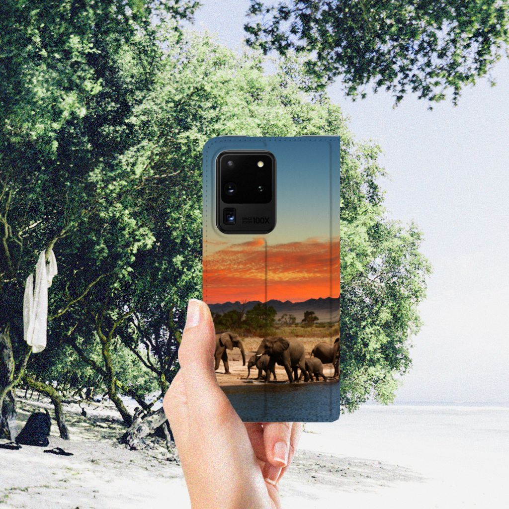 Dit hoesje is zo sterk als een olifant. Dat is goed nieuws, want jouw telefoon heeft een zeer goede bescherming nodig. Dat krijg je met dit design hoesje met print van Olifanten. De Afrikaanse olifant, het allergrootste landdier ter wereld, heeft waarschijnlijk het meest te lijden gehad van stroperij om het ivoor. Deze dieren verdienen dus een goede bescherming, net als jouw smartphone. Met een Samsung Galaxy S20 Ultra Hoesje maken met olifant erop krijg je dit zeker voor elkaar. De stand case beschermt alle zijden van je telefoon en heeft aan de binnenzijde een vakje waarin je een pasje kunt opbergen. De sterke olifant komt zeer goed tot zijn recht op deze case, die aan de binnenkant een houder heeft van tpu. Ook de magneet aan de binnenkant is zeer handig. Alle zijden van de case worden bedrukt met olifanten.