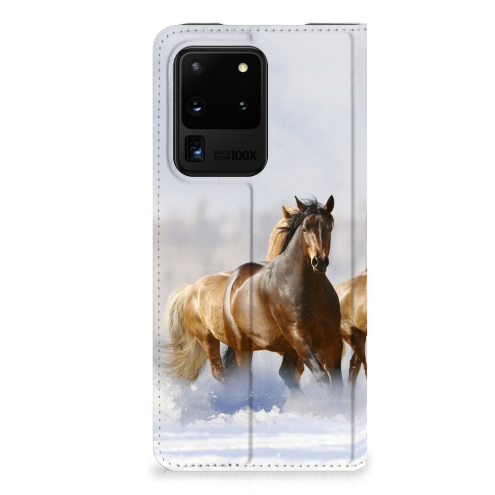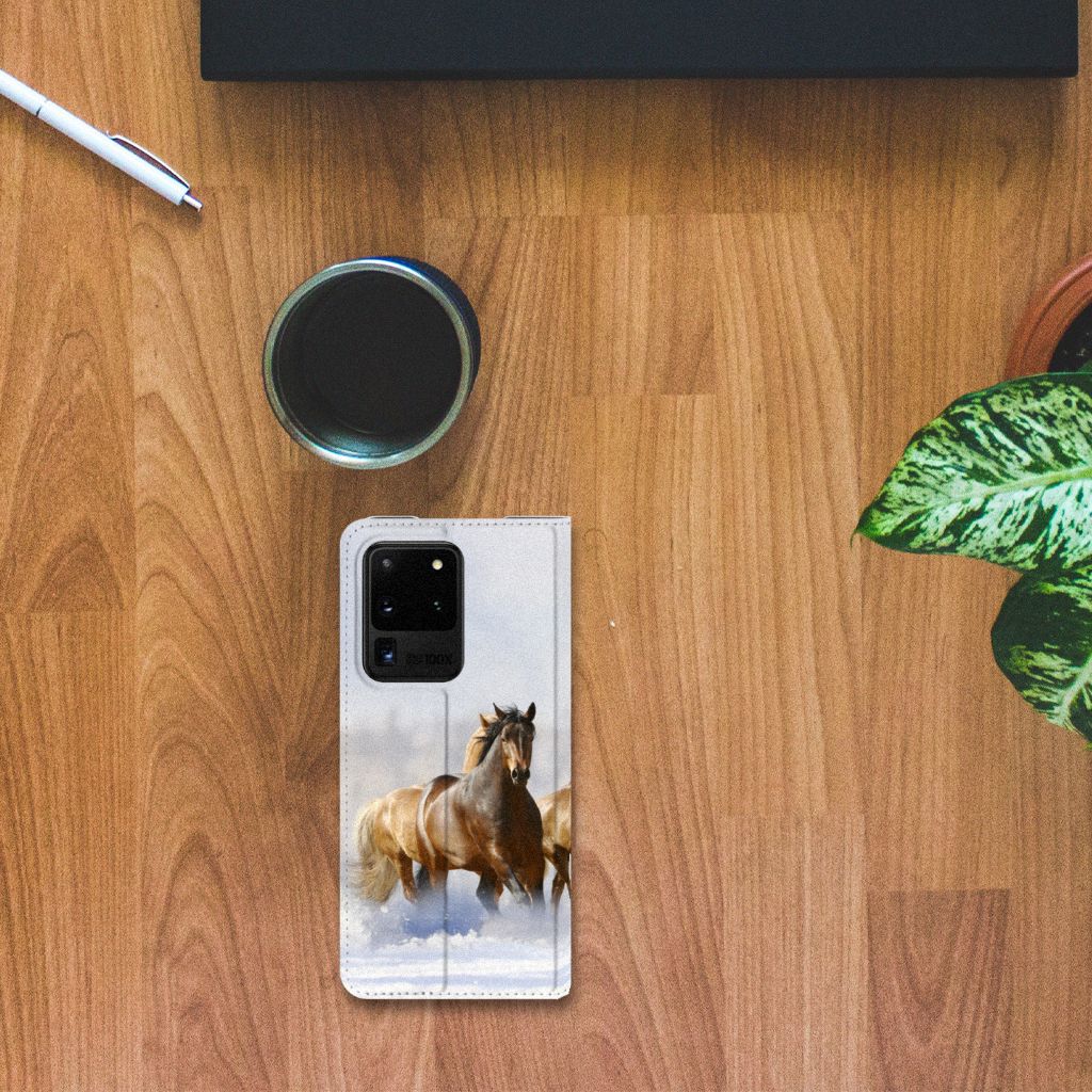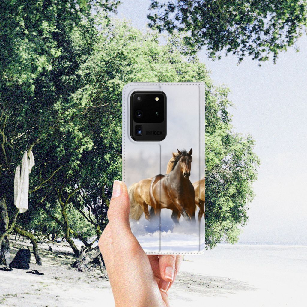 Voor de paardenliefhebbers onder ons hebben we onze collectie uitgebreid met dit design hoesje met print van paarden. Vroeger hield de mens vooral werkpaarden, inmiddels hebben we vriendschap gesloten met het paard. Vandaar dat het ook een favoriet dier is op onze smartphonehoesjes, zoals deze stand cases. Deze Samsung Galaxy S20 Ultra Hoesje maken met Paarden is niet alleen super mooi en chique, het sluit ook nog perfect dankzij de magneet aan de binnenzijde. Verder heeft de case een TPU houder aan de binnenzijde en een houder voor een pasje. Zie je liever je eigen paard terug op een hoesje? Dat kan! Door zelf een uniek hoesje te ontwerpen, met eigen foto’s en teksten. De stand case met paarden wordt aan alle zijden bedrukt.