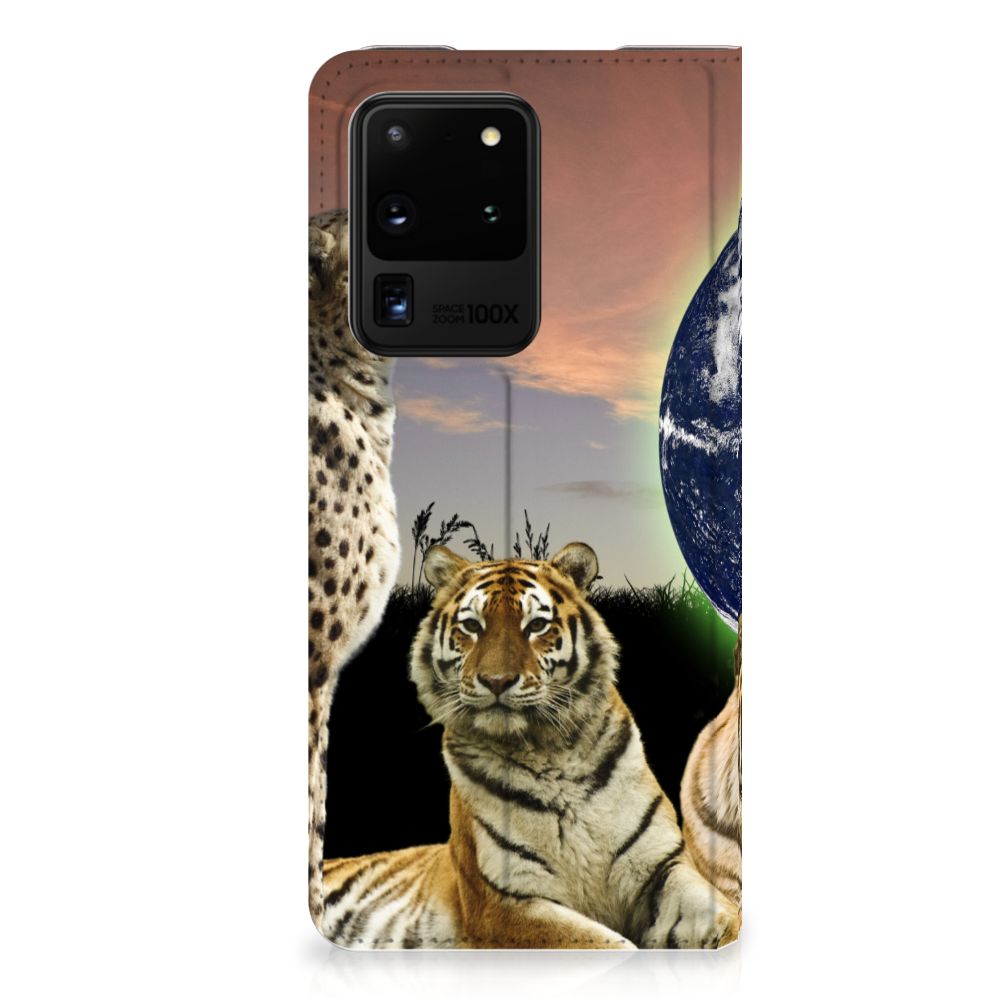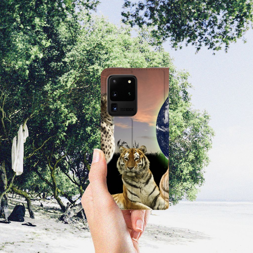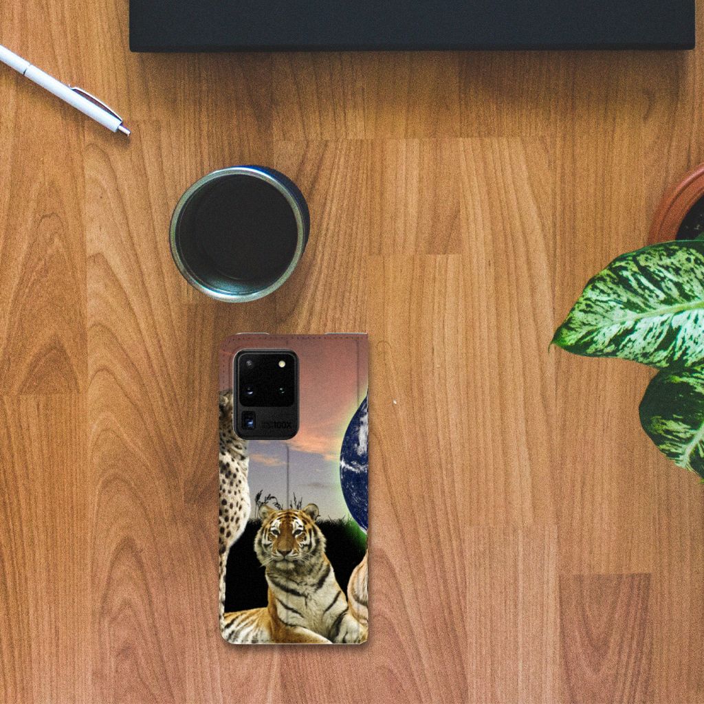 Deze standcase met roofdieren kan exclusief in het bezit van jou komen. Bovendien kun je hier zelf nog unieke teksten en/of beelden aan toevoegen. Je Hoesje maken krijgt dan een unieke identiteit. Roofdieren zoals tijgers op dit hoesje zijn voortdurend op zoek naar een geschikte prooi. De tijgers met aardbol op de achtergrond op deze stand case geven jouw Samsung Galaxy S20 Ultra een hele stoere uitstraling. Deze bijzondere case is van PU-leer (buitenzijde) en TPU (binnenzijde) en beschikt over een houder en een speciale standaard. Verder is deze stand case met roofdieren voorzien van een magnetische sluiting aan de binnenzijde. Je zorgt voor de perfecte bescherming van je smartphone met dit design hoesje met roofdieren met aardbol op de achtergrond.