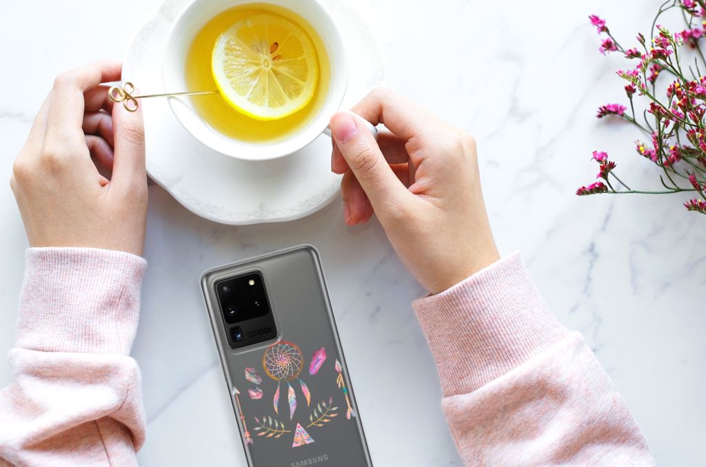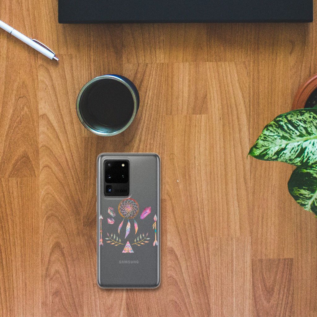 Een dromenvanger werd lang geleden al door een indianenvolk in Noord-Amerika gebruikt om nare dromen te weren. Nu nog hangen mensen over de hele wereld dromenvangers boven hun bed. Maar ook op een telefoonhoesje staat zo’n boho dreamcatcher heel mooi. Dit mooie design dat bestaat uit een tipi, pijlen en dromenvanger heeft veel verschillende prachtige kleuren. Maar omdat het ontwerp minimalistisch en klein is, is het design toch subtiel te noemen. Dit ontwerp staat op een Telefoonhoesje met Naam voor je Samsung Galaxy S20 Ultra. TPU is flexibel en heel erg sterk. Zo is je telefoon aan de achterkant en de randen heel goed beschermd. De case is aan de bovenkant bedrukt, de randen blijven transparant. Het TPU-hoesje is perfect te combineren met een screenprotector, zo zijn je telefoon en je beeldscherm altijd goed beschermd.