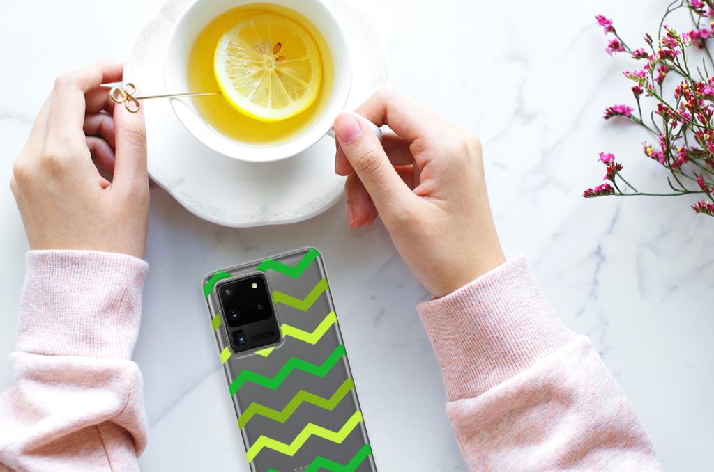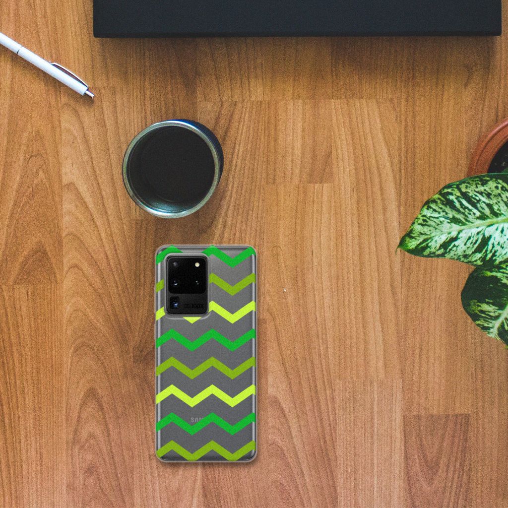Dit zigzag groene design hoesje is speciaal ontworpen voor jou. We hebben bewust verschillende stijlen groen gebruikt, zodat er voldoende sprake is van variatie. Dit groene hoesje ziet er super strak uit. Dat kan ook niet anders als je weet dat onze designer zijn creativiteit heeft gebruikt. Hij schudt voortdurend nieuwe designs uit zijn mouw en dit zigzag groene hoesje is een van zijn fraaiste creaties. Een heel tof Samsung Galaxy S20 Ultra TPU bumper, al zeggen we het zelf. Valt dit Zigzag Groen design hoesje goed bij jou? Bestel het dan vandaag nog en je hebt het morgen in huis. Het design staat op een TPU case. Dit hoesje wordt alleen aan de bovenkant bedrukt en is zeer flexibel. De randen van het hoesje blijven transparant en worden niet bedrukt. Met dit hoesje past jouw telefoon altijd in je broekzak.