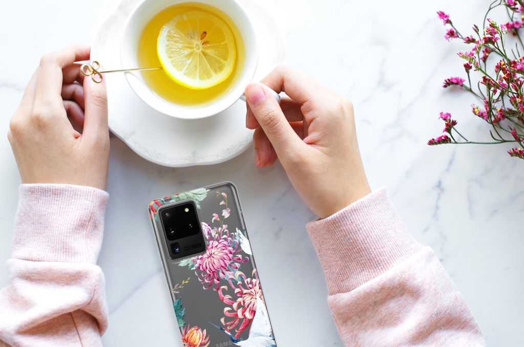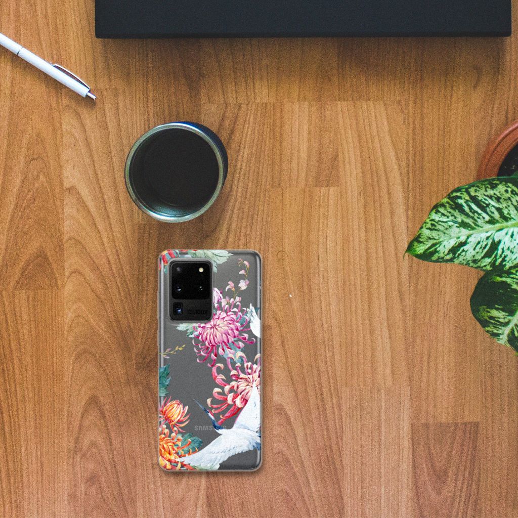 Verspreid over de hele wereld leven 19 soorten ooievaars. De spanwijdte – dat is de afstand van vleugeltip tot vleugeltip – van een volwassen ooievaar kan 2.50 meter bedragen. De gebieden waarin de ooievaar broedt, liggen in heel Europa, het Midden-Oosten, West- en Centraal-Azië en Noordwest-Afrika. Het ideale leefgebied van de ooievaar is een half open tot open landschap met veel afwisseling in grondgebruik en begroeiing. De begroeiing op dit design hoesje, in allerlei verschillende kleuren, zal niet alleen voor de ooievaars fraai zijn. Jij zult er zelf ook heel vrolijk van worden. Het in het oog springende design staat op een TPU Hoesje. Dit telefoonhoesje wordt alleen aan de bovenkant bedrukt en is zeer flexibel. De randen van het hoesje blijven transparant en worden niet bedrukt. Met dit hoesje past jouw Samsung Galaxy S20 Ultra altijd in je broekzak.