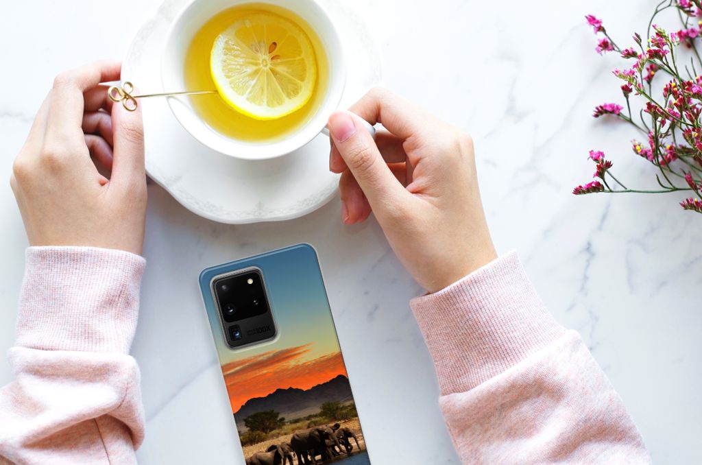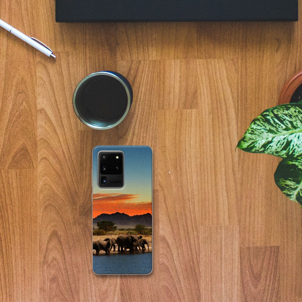 Dit hoesje is zo sterk als een olifant. Dat is goed nieuws, want jouw telefoon heeft een zeer goede bescherming nodig. Dat krijg je met dit design hoesje met print van Olifanten. De Afrikaanse olifant, het allergrootste landdier ter wereld, heeft waarschijnlijk het meest te lijden gehad van stroperij om het ivoor. Deze dieren verdienen dus een goede bescherming, net als jouw smartphone. Met een Samsung Galaxy S20 Ultra TPU Hoesje met olifant erop krijg je dit zeker voor elkaar. De tpu case beschermt vooral de achterkant en zijkanten van je telefoon en is gemaakt van onbreekbaar materiaal. De sterke olifant komt zeer goed tot zijn recht op deze case, die zeer flexibel is. Alleen de bovenzijde van de case wordt bedrukt met olifanten, de zijkanten blijven transparant.