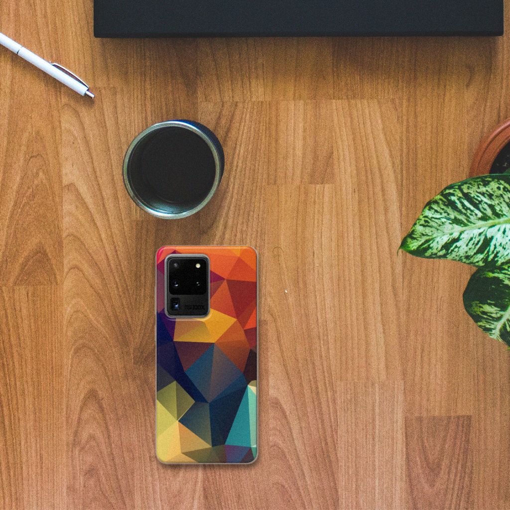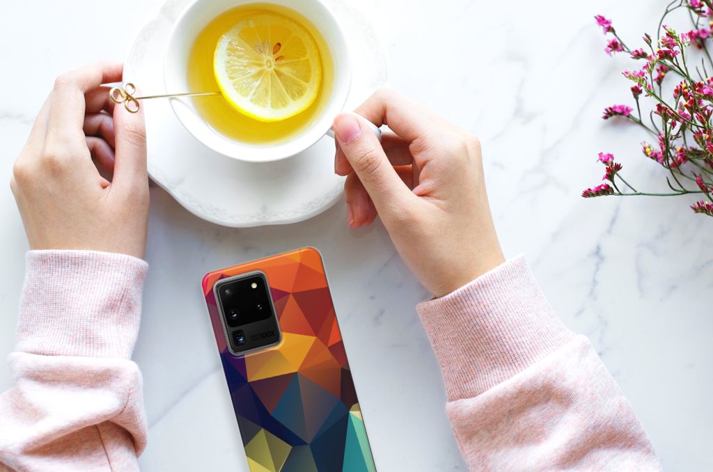 Veelkleurige driehoeken die samen eindeloze asymmetrische patronen lijken te vormen. Het is het abstracte schouwspel dat op dit fraaie hoesje voor je Samsung Galaxy S20 Ultra direct de aandacht trekt noemen we voor het gemak trekt noemen we voor het gemak Polygon Color. De een ziet er een berglandschap in, de ander piramides. Wat zie jij erin? Zeker is in elk geval dat de aanblik van dit fascinerende ontwerp je niet snel gaat vervelen. Het kleurige spel van lijnen en vlakken blijft eindeloos boeien en geeft jouw TPU Hoesje een hippe en kunstzinnige uitstraling. De kracht die het lijnenspel uitstraalt, komt ook terug in het hoesje zelf. Dit hoesje wordt alleen aan de bovenkant bedrukt en is zeer flexibel. De randen van het hoesje blijven transparant. Wat wil je nog meer?