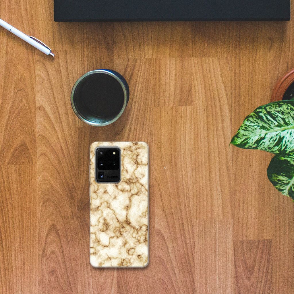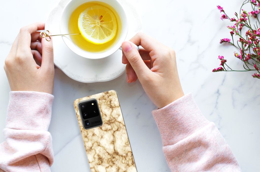 Deze Samsung Galaxy S20 Ultra TPU Siliconen Hoesje met Marmer Goud is het waard om een blokje voor om te rijden. Dit is overigens niet nodig. Als je het hoesje met goud marmer nu bestelt heb je het zeer snel in huis. Je kunt er bij wijze van spreken thuis op gaan zitten wachten. Je hebt diverse soorten marmer. We hebben enkele fraaie kleuren op onze hoesjes gezet, zoals in dit geval het gouden marmer. Het goud marmer wordt bedrukt op de achterkant van de tpu case, die beschikt over alle nodige uitsparingen waardoor je alle knoppen en poorten van je smartphone kunt bedienen. Verder is de case met goud marmer gemaakt van zeer flexibel materiaal. De rijkheid aan kleuren en varianties in afwerking is een schitterende eigenschap van marmer. Dit tpu hoesje met goud marmer heeft ook veel schitterende eigenschappen en is de ideale bescherming voor jouw smartphone.