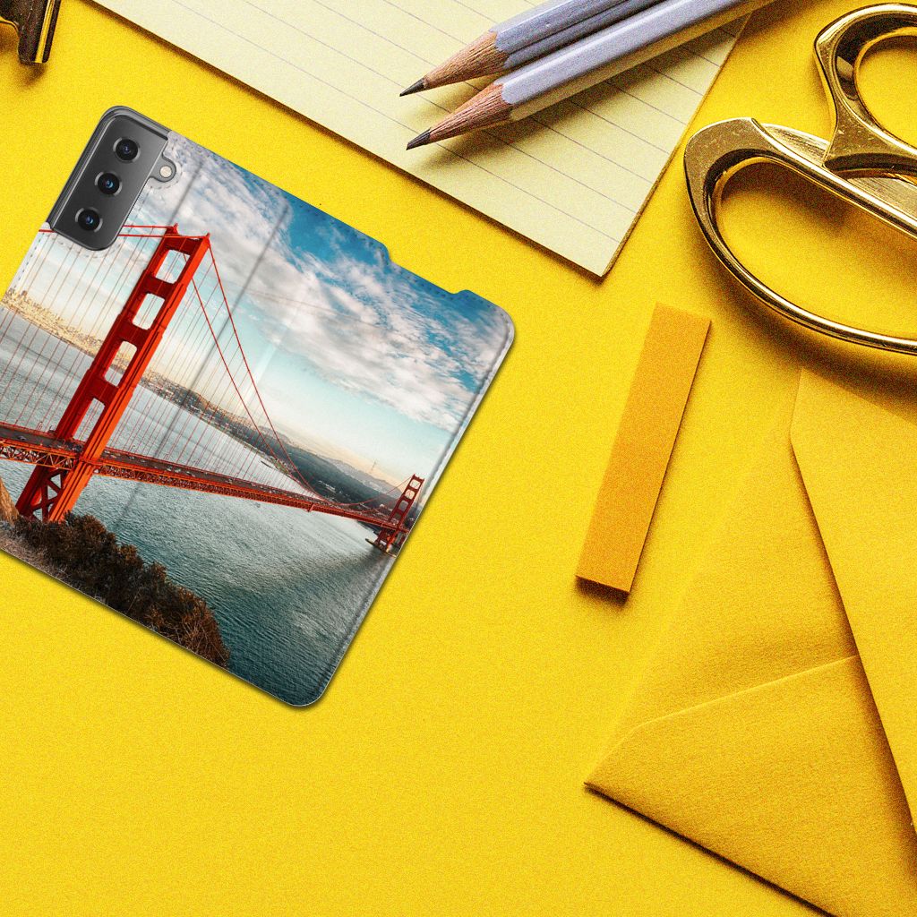 De Golden Gate Bridge is een technisch meesterwerk. Een van de langste en hoogste hangbruggen ter wereld is een schitterend staaltje van ingenieurskunst en een prachtig monument, dat met de rode kleur fel afsteekt tegen de omgeving. Dit monument komt op een fraaie manier tot uitdrukking op deze Samsung Galaxy S21 Book Cover. Het telefoonhoesje met design heeft 1 opbergvakje, waarin je een pasje of briefgeld kunt stoppen. Jouw telefoon past precies in de houder van TPU en de case wordt aan de binnenzijde magnetisch afgesloten. De Golden Gate Bridge is vanuit vele plekken in en rond San Francisco op een spectaculaire manier zichtbaar. Alle kanten van het telefoonhoesje worden bedrukt met foto’s van dit monument. Jouw telefoon is aan alle kanten goed beschermd met dit design hoesje met Golden Bridge print.